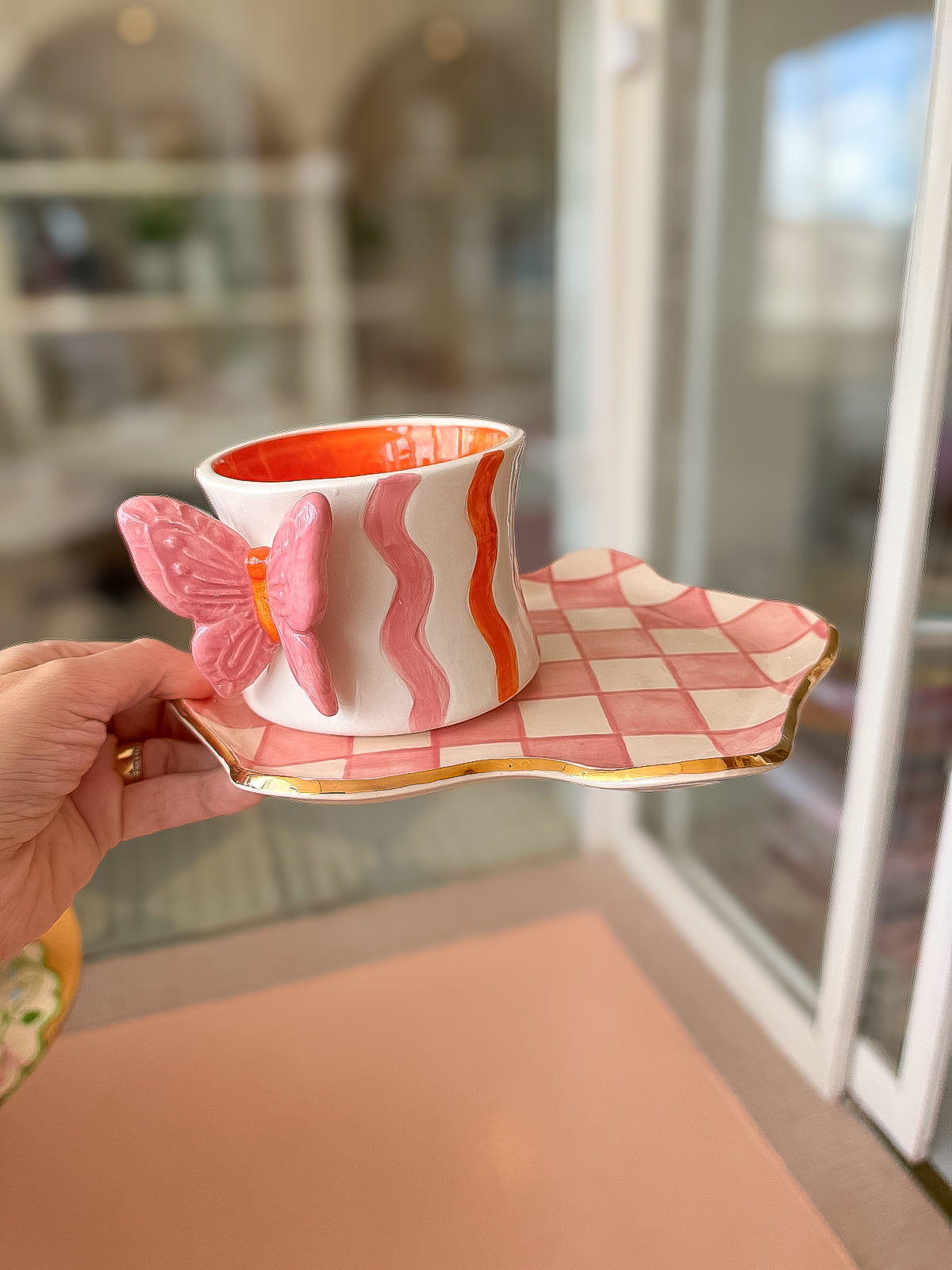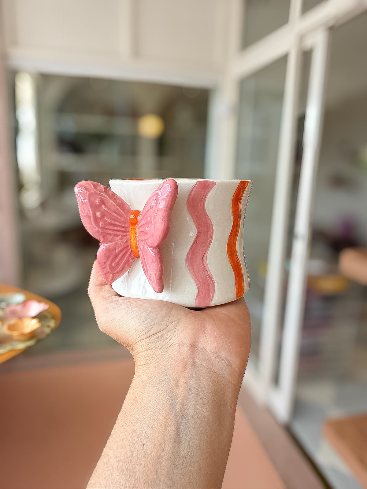Delicada e cheia de charme, a Caneca Borboleta Encanto Rosa em Cerâmica traz um toque romântico e contemporâneo para os seus momentos de pausa. Com base em tom off-white e listras onduladas em rosa e laranja, a peça combina suavidade e personalidade em um design autoral.