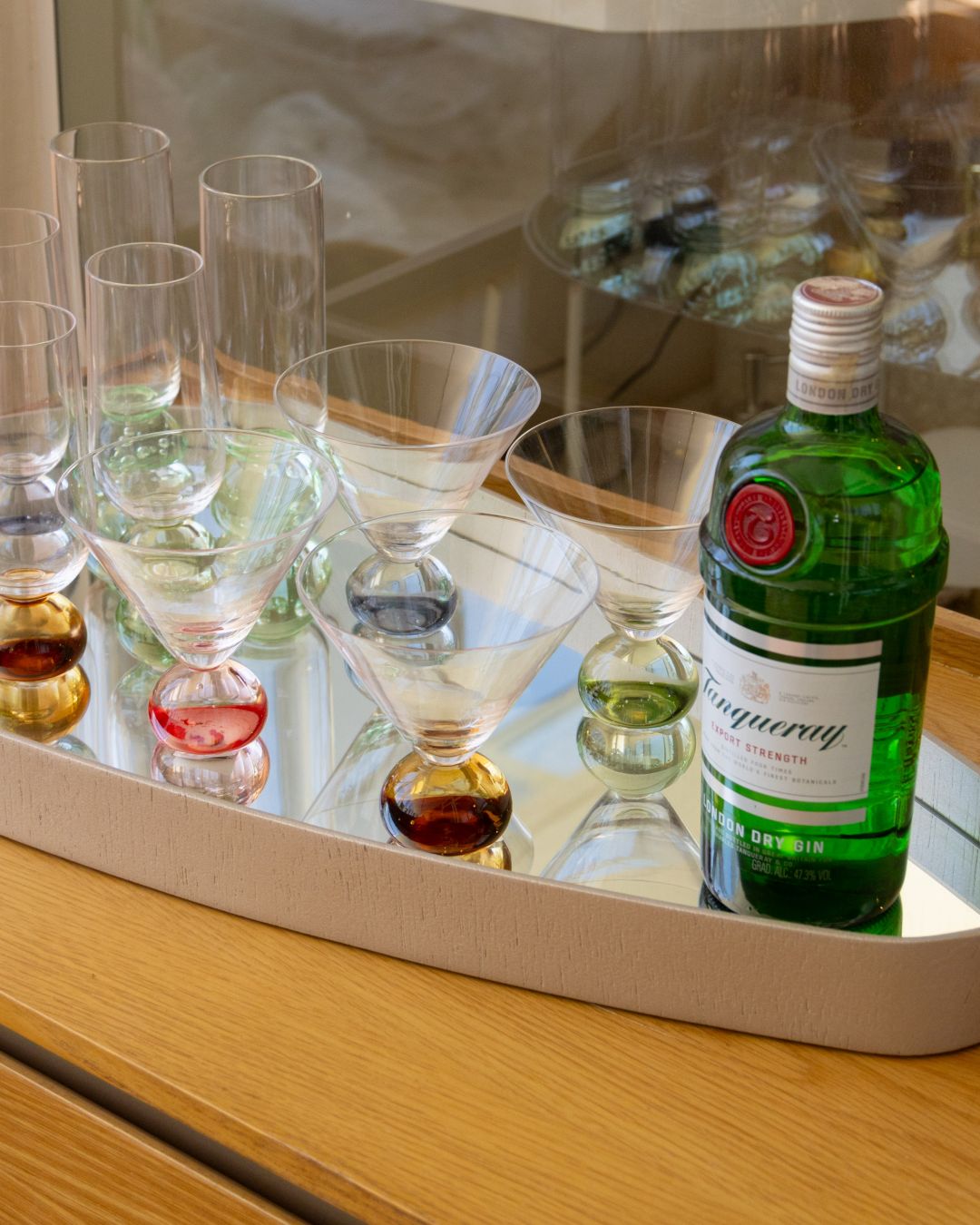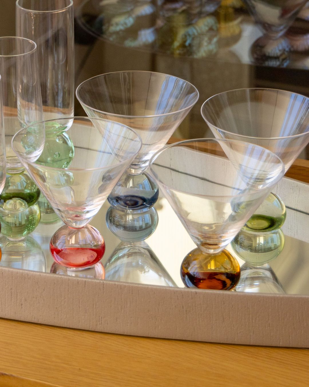 O design se destaca pelo contraste entre o corpo em vidro cristalino e as bases arredondadas e vibrantes, que funcionam como pequenos globos de cor na mesa. A silhueta aberta das taças valoriza as sobremesas e também permite que sejam usadas como copos para drinks criativos.