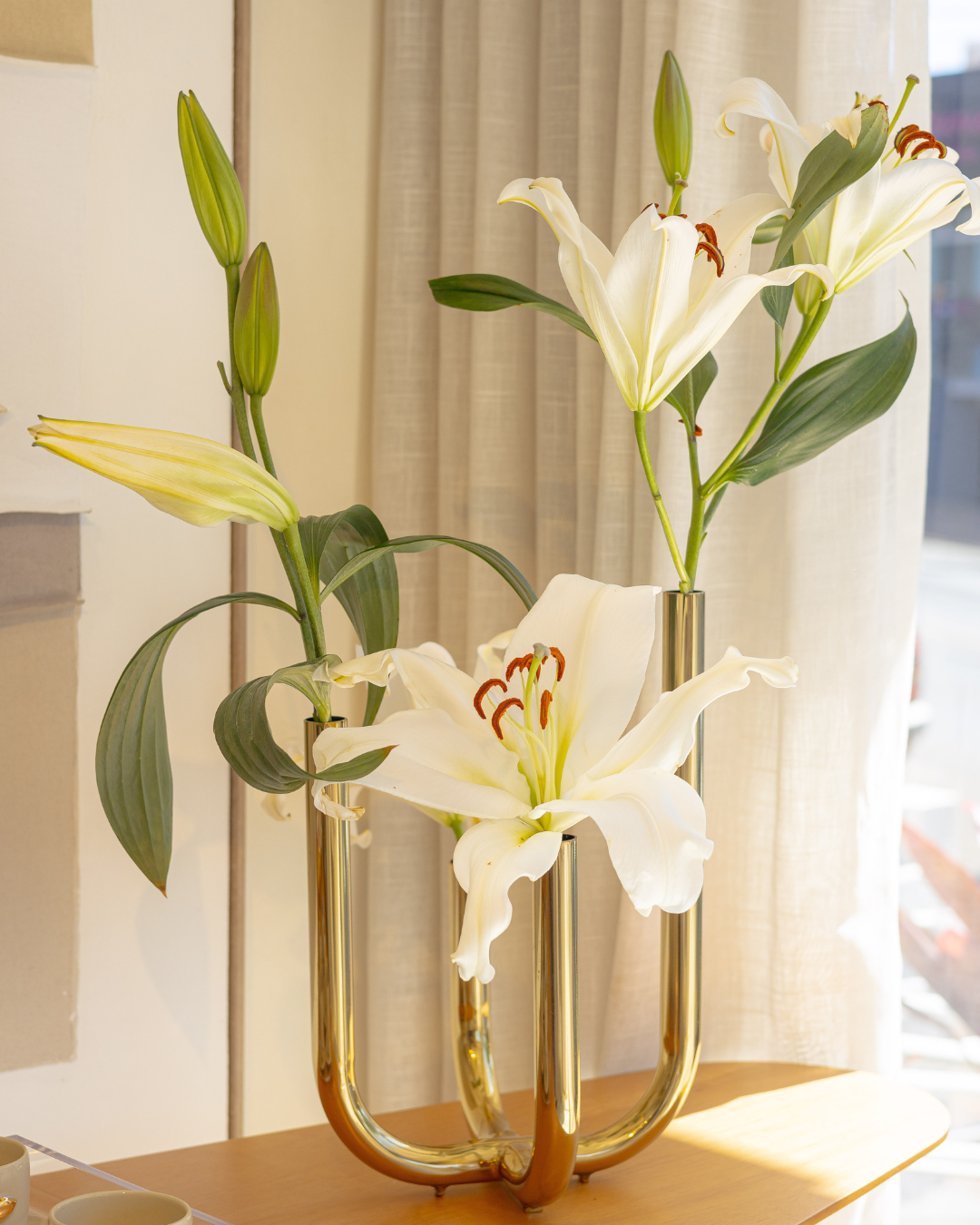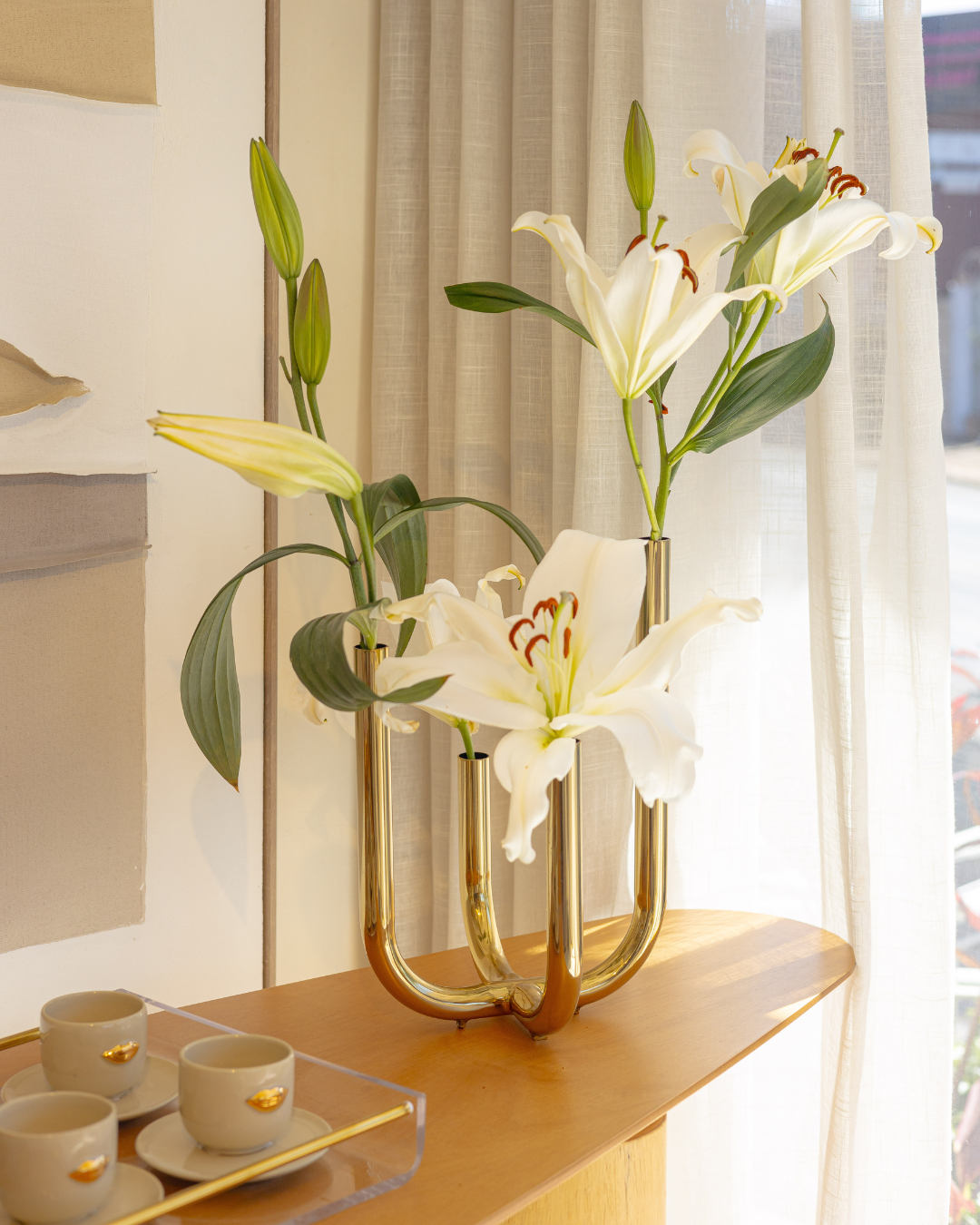 • Design: Escultural e moderno, com quatro tubos curvados que formam "pontas" distintas para acomodar flores. A base une os tubos, garantindo estabilidade.