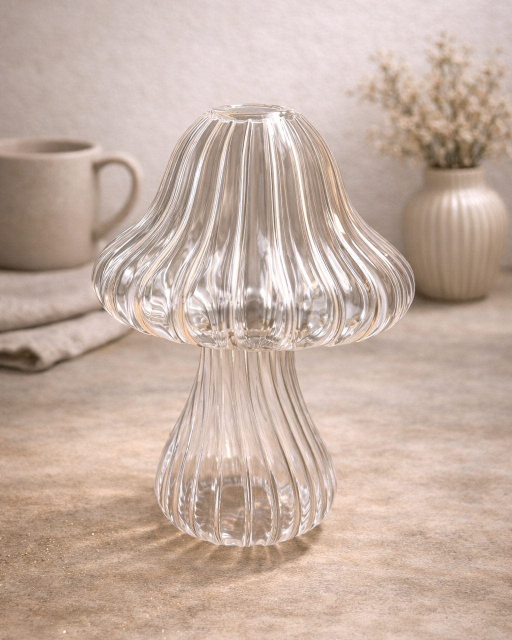 O Vaso Funghi Glass em Vidro é uma peça delicada e escultural, inspirada nas formas orgânicas da natureza e na leveza do design contemporâneo. Seu formato fluido, com curvas suaves e proporções equilibradas, remete à silhueta de um cogumelo, criando uma presença charmosa e sofisticada na decoração.