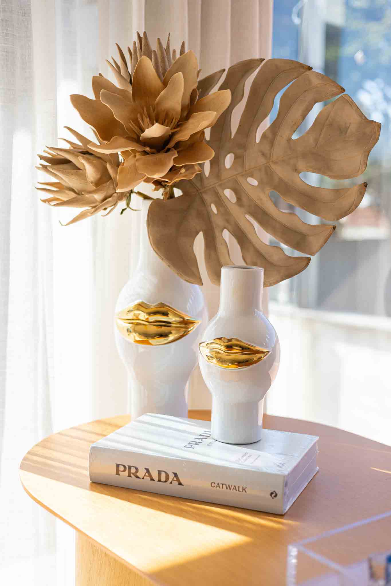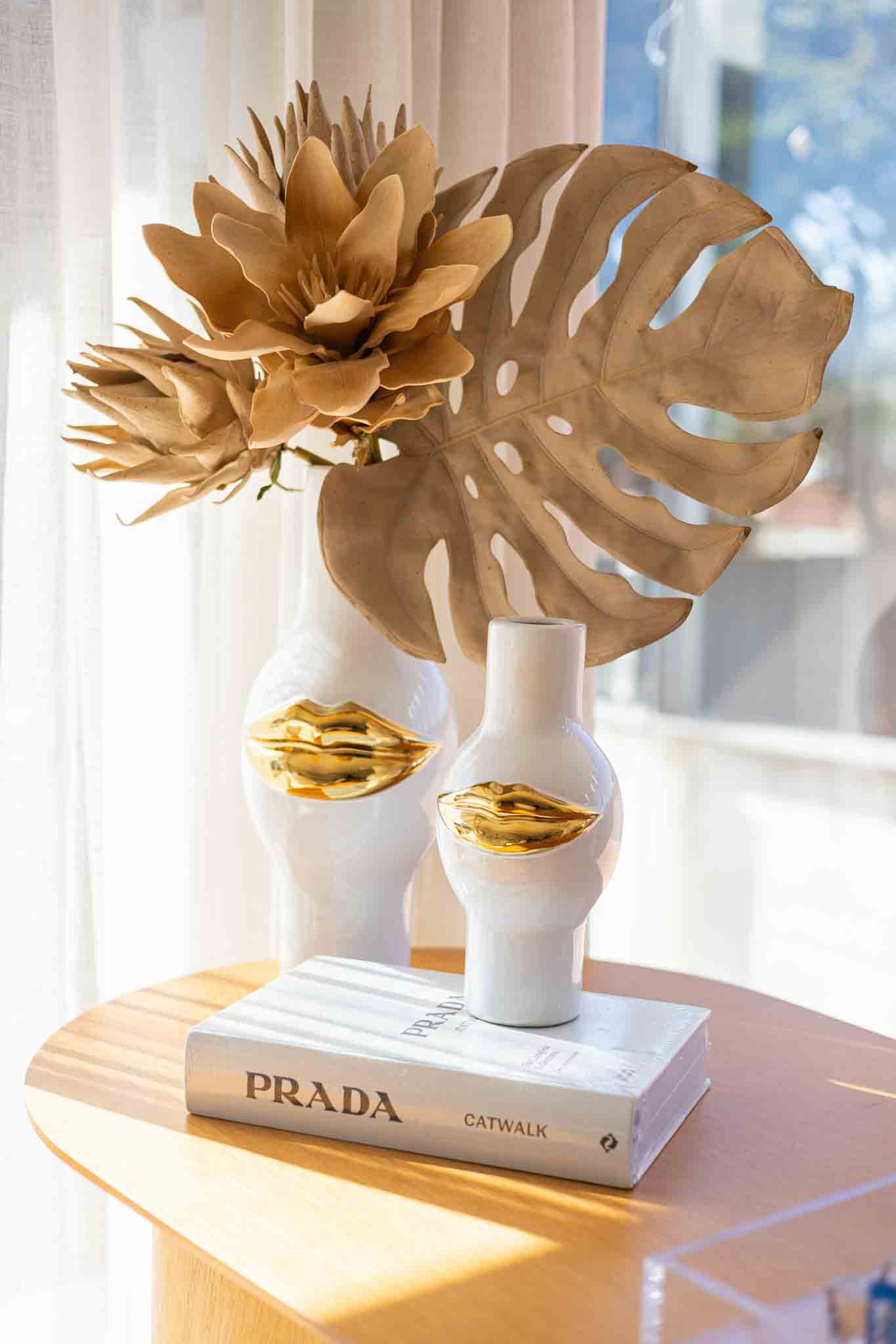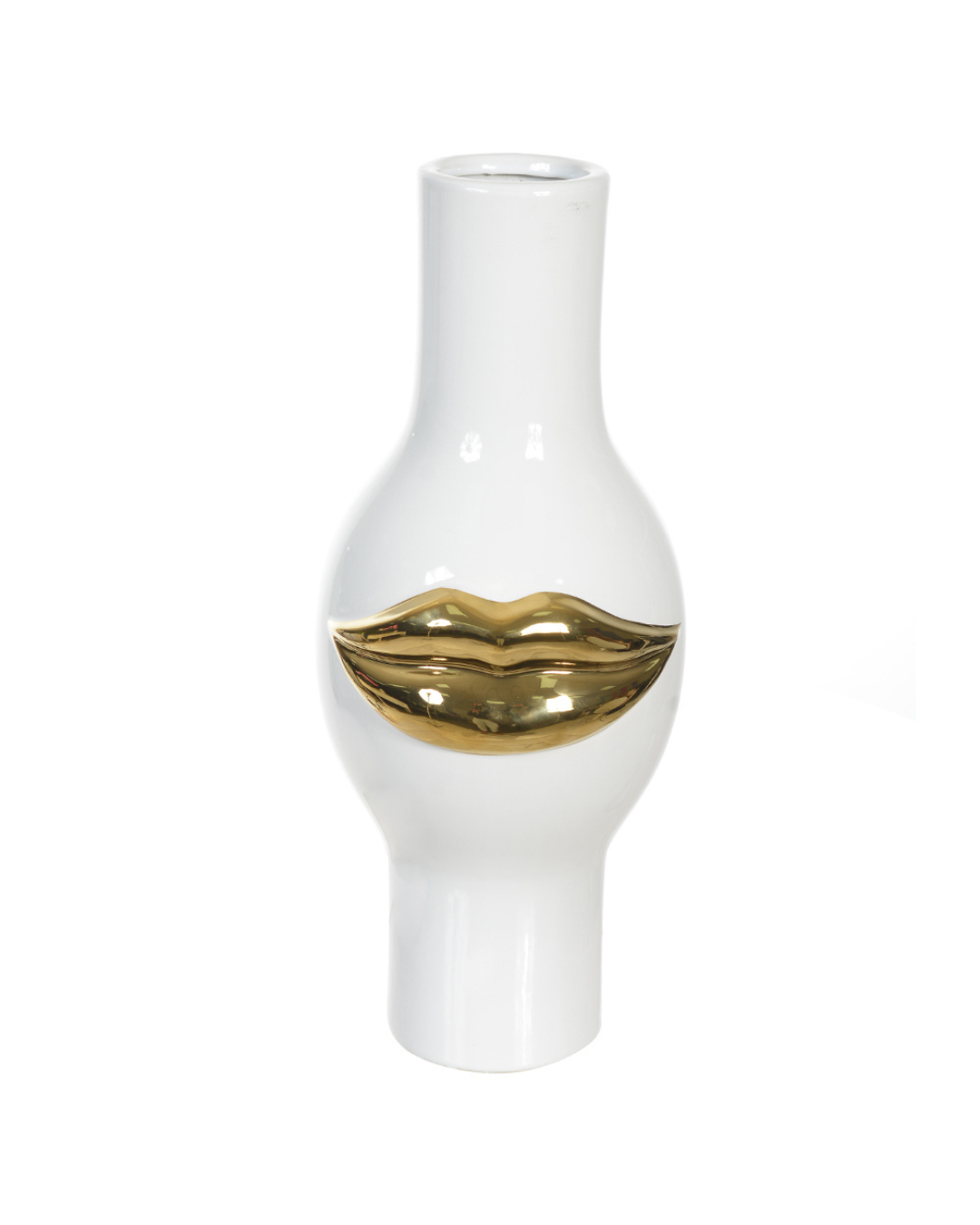 Com design ousado e acabamento brilhante, o Vaso de Cerâmica Branco com detalhe de lábios dourados é uma peça que celebra o estilo e a personalidade. Sua estética contemporânea e escultural transforma qualquer ambiente com um toque de arte e irreverência.
