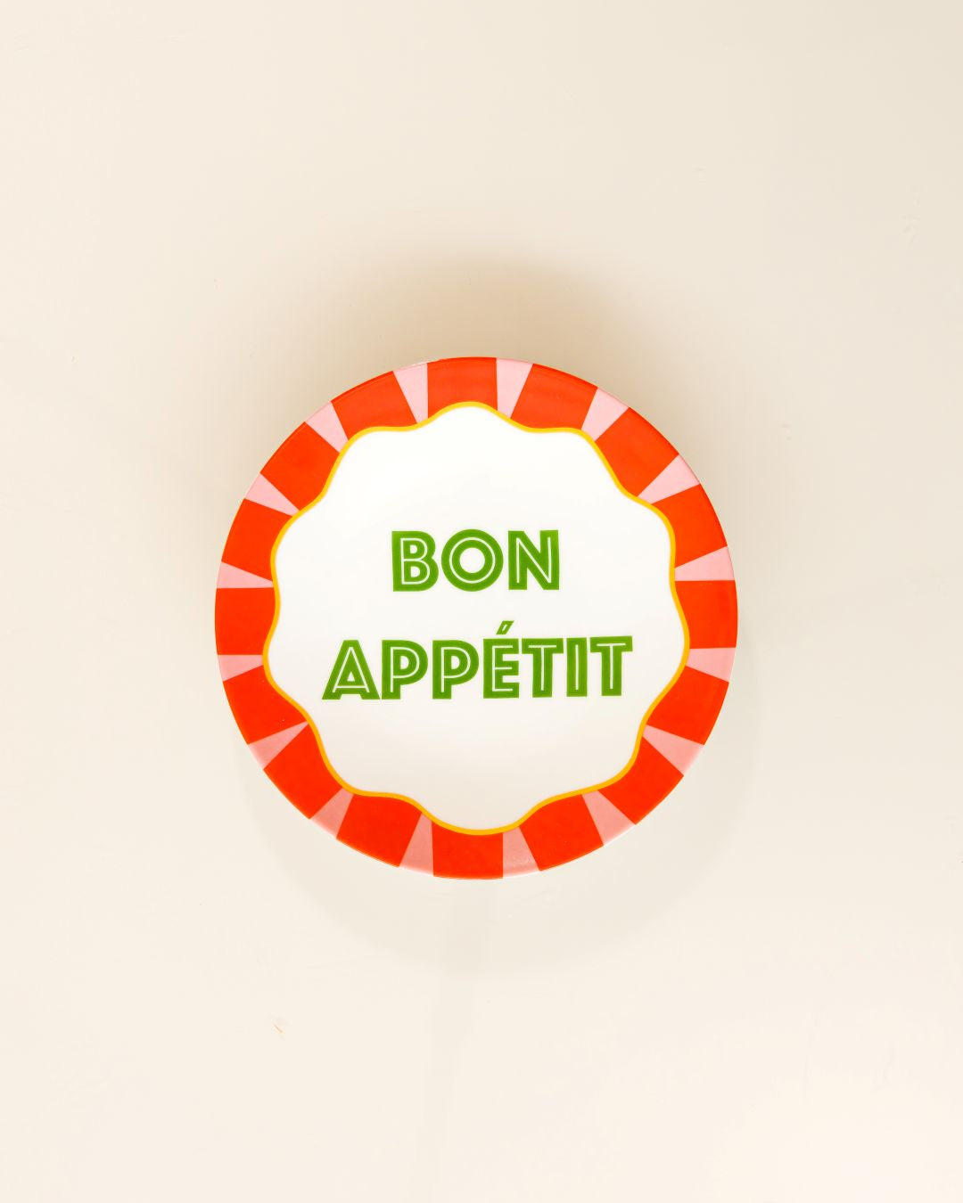 O Prato de Sobremesa Bisous Sucrés Bon Appétit traduz frescor, leveza e alegria à mesa. Com tipografia em verde vibrante e moldura em tons quentes, a peça traz uma estética gráfica contemporânea que valoriza a composição da mesa e cria um ponto de destaque elegante e divertido.