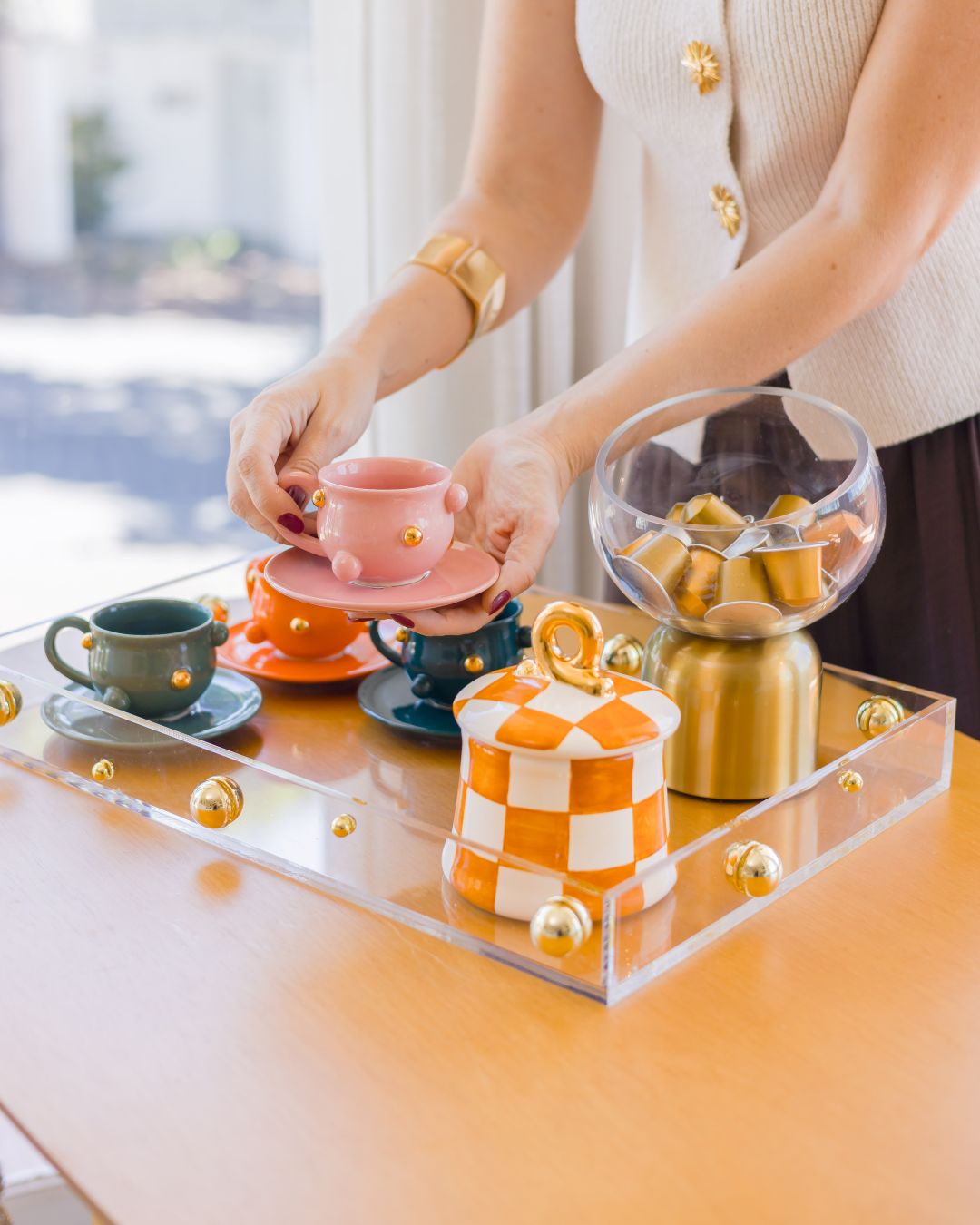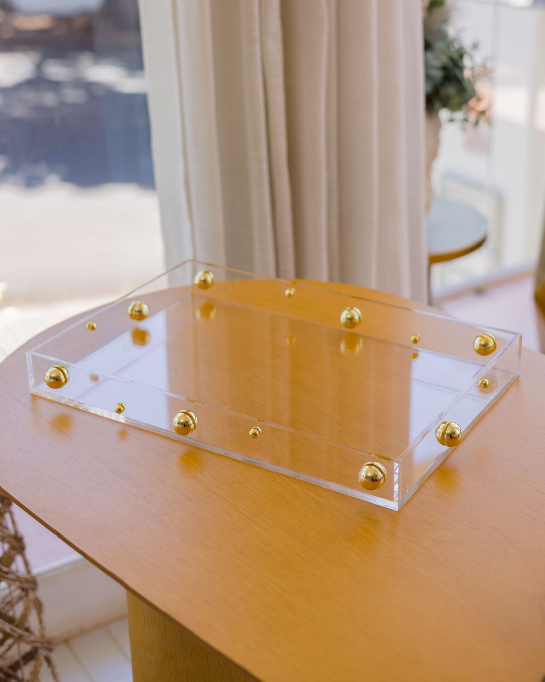 A Bandeja Orbes de Ouro em Acrílico é a expressão perfeita da elegância contemporânea com um toque sofisticado de brilho. Produzida em acrílico cristal de alta transparência, ela se destaca pelas delicadas esferas douradas aplicadas nas laterais, criando um efeito visual leve, moderno e extremamente refinado.