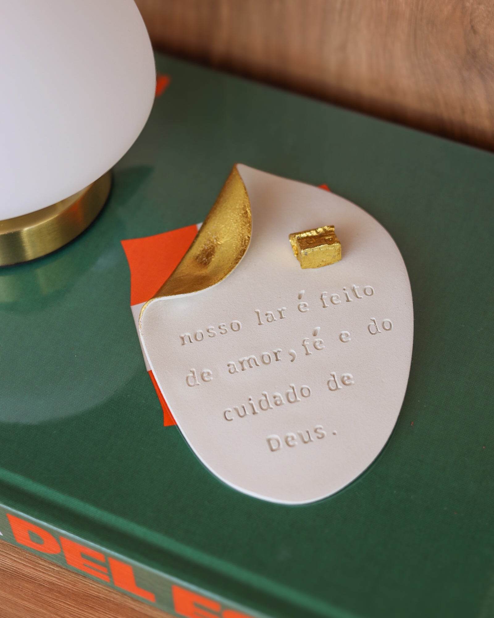 Seu formato orgânico, com curvas suaves e toque contemporâneo, combina perfeitamente com o detalhe dourado — aplicado manualmente — que ilumina a peça e reforça sua simbologia. A pequena casinha dourada, colocada com afeto, adiciona personalidade e reforça o tema do lar como espaço sagrado.