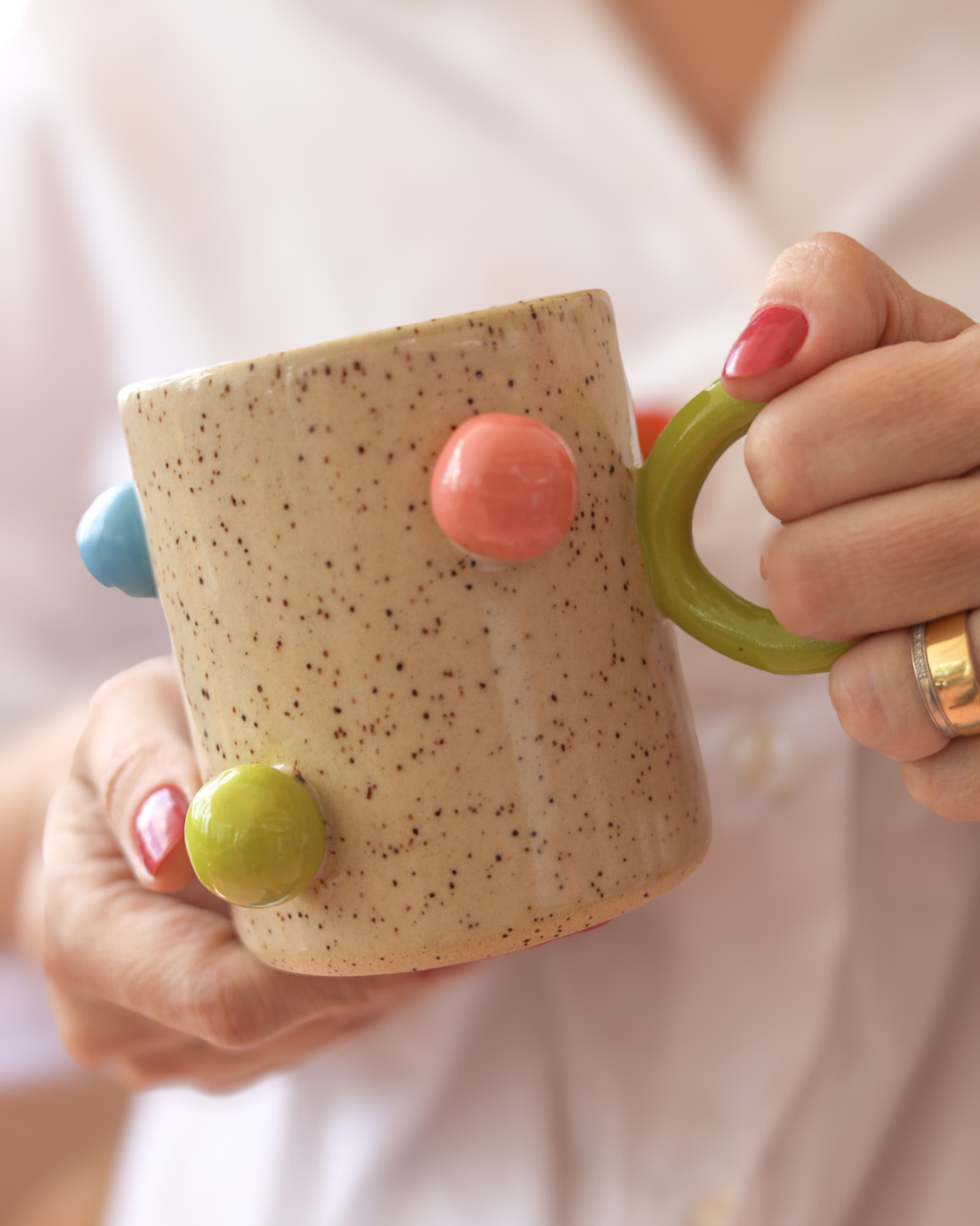 A Caneca Bubblegum é pura alegria na mesa. Produzida em cerâmica com acabamento artesanal, apresenta base em tom neutro pontilhado e aplicações de bolinhas esmaltadas em cores vibrantes, criando um visual divertido e acolhedor. Seu formato confortável e a alça arredondada garantem uma pegada firme e agradável para o dia a dia.