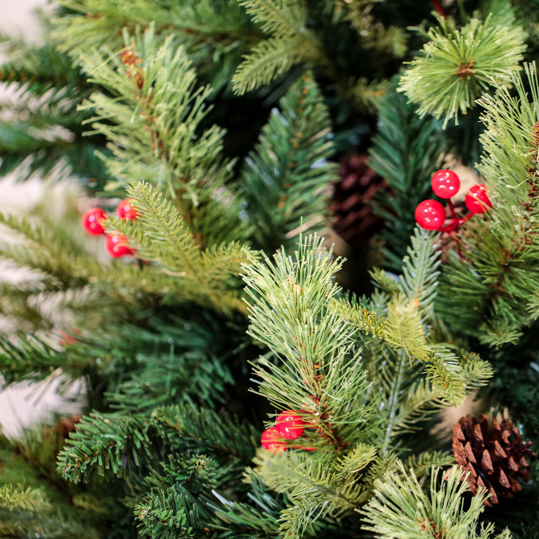Seu mix de folhagens em tons de verde diferentes proporciona profundidade e realismo, enquanto os detalhes decorativos — pinhas naturais e ramos com frutinhas vermelhas — já trazem um toque de magia natalina sem a necessidade de muitos adornos adicionais.