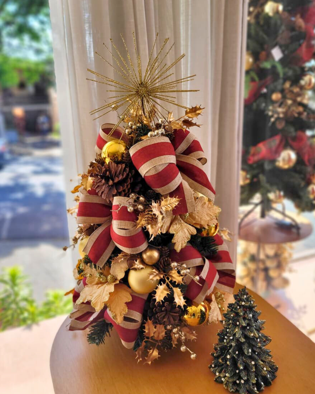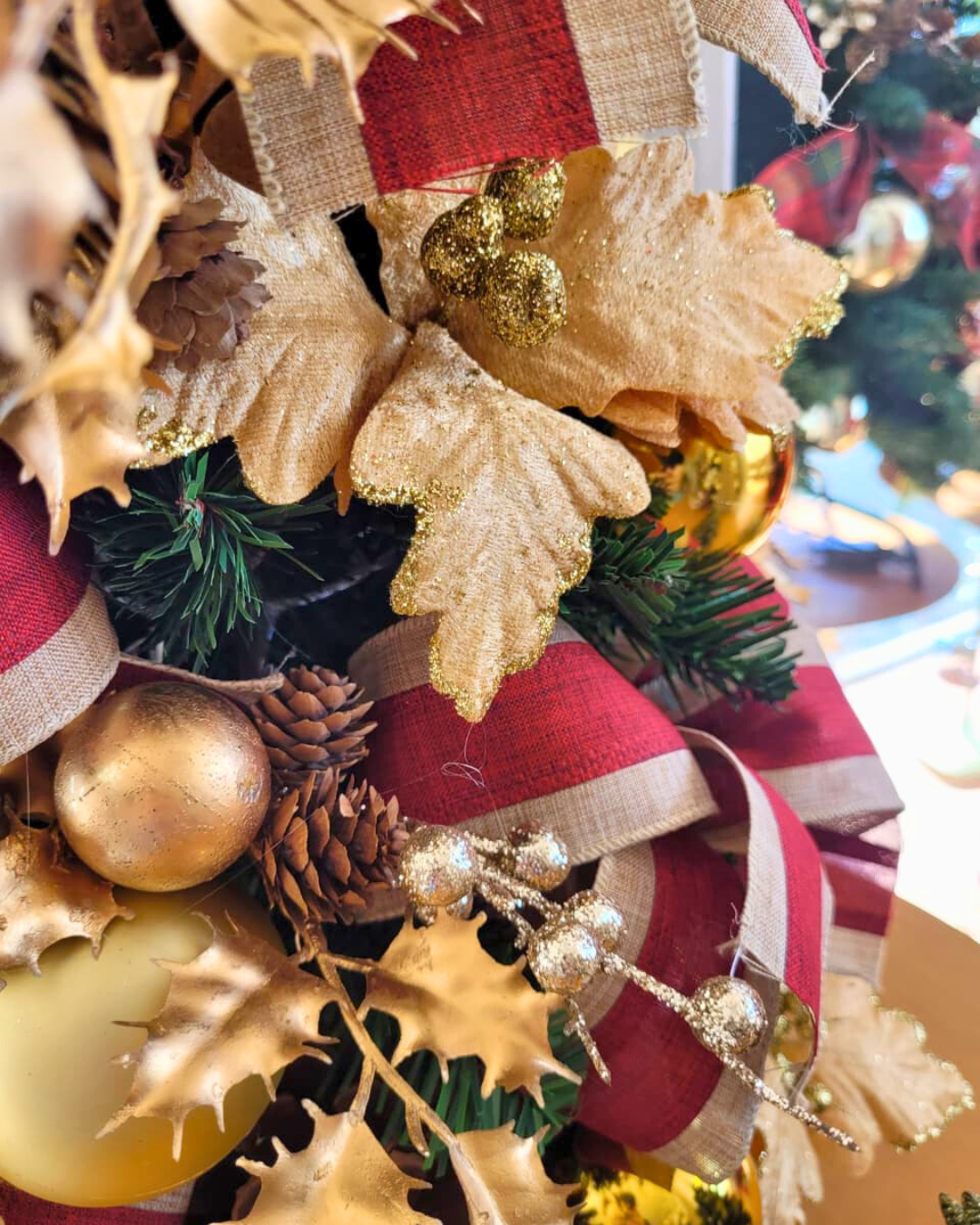 • Detalhes em pinhas, folhas douradas e laços de tecido