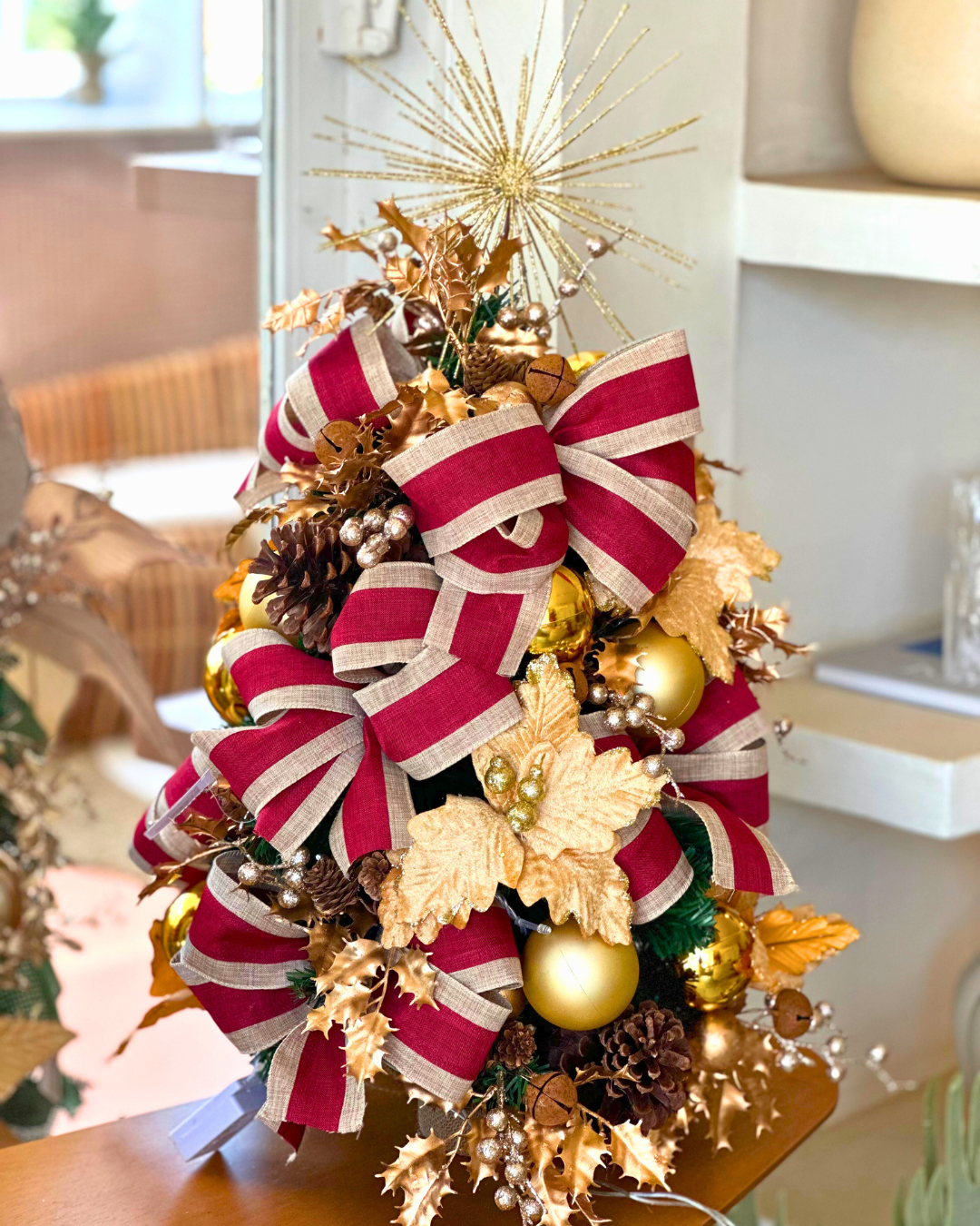 Com laços em tecido encorpado, folhas douradas, esferas metálicas e detalhes naturais, a Autumn Lux transmite uma sensação de aconchego e requinte — perfeita para quem deseja uma decoração natalina clássica, porém com um toque contemporâneo. Seu topo é coroado por uma estrela dourada, símbolo de luz e celebração, completando o visual com delicadeza e sofisticação.