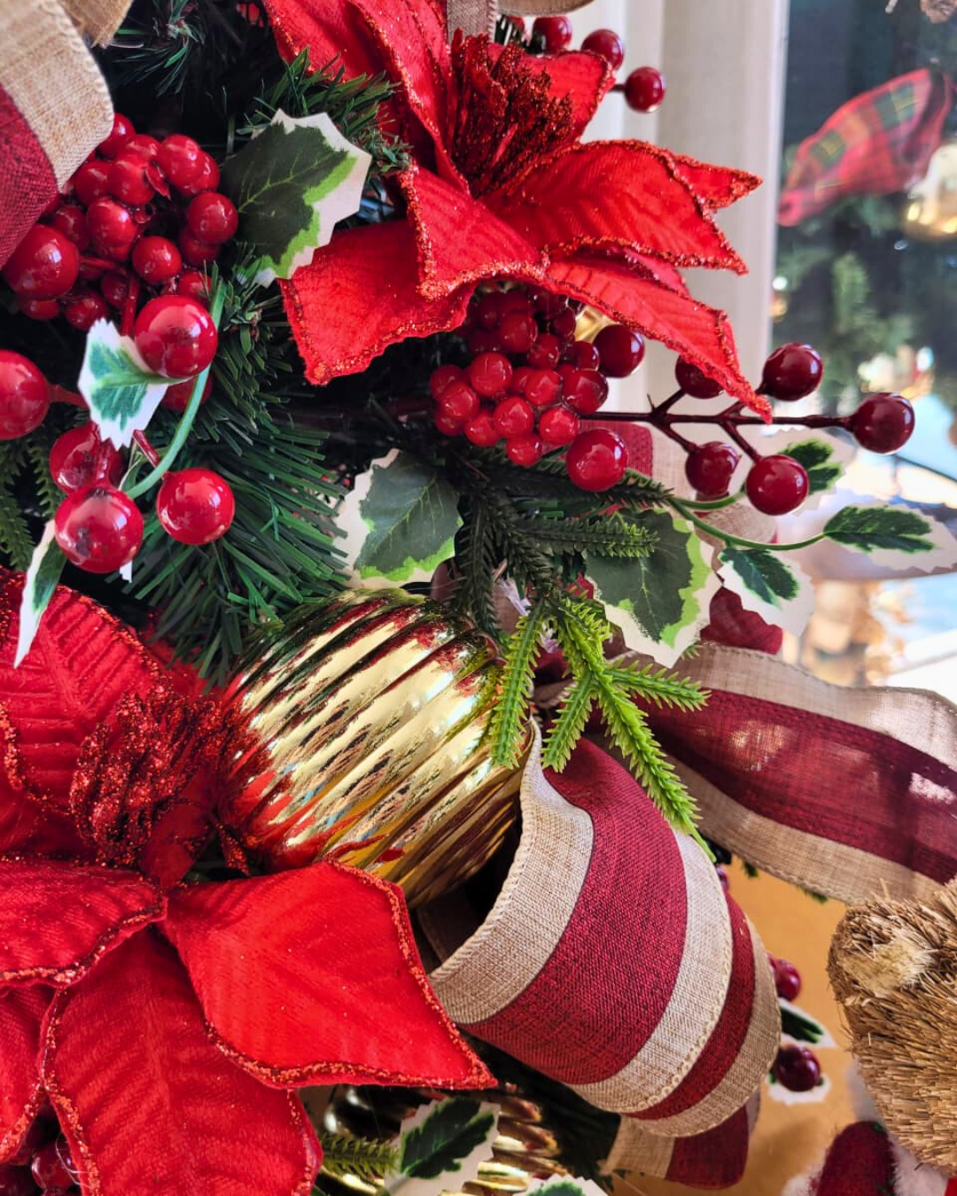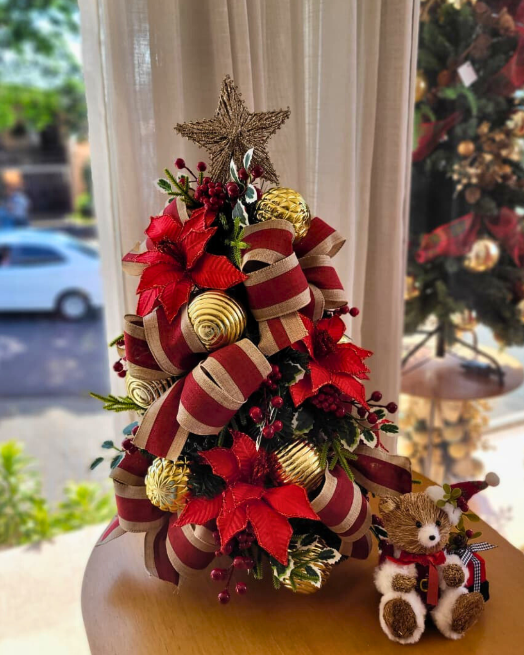 Ricamente adornada com laços em tecido texturizado, flores de poinsétia, folhagens e esferas douradas, a Christmas Charm é um destaque em qualquer ambiente. Seu acabamento artesanal garante um visual equilibrado e refinado, ideal para mesas, aparadores ou cantinhos especiais da casa.