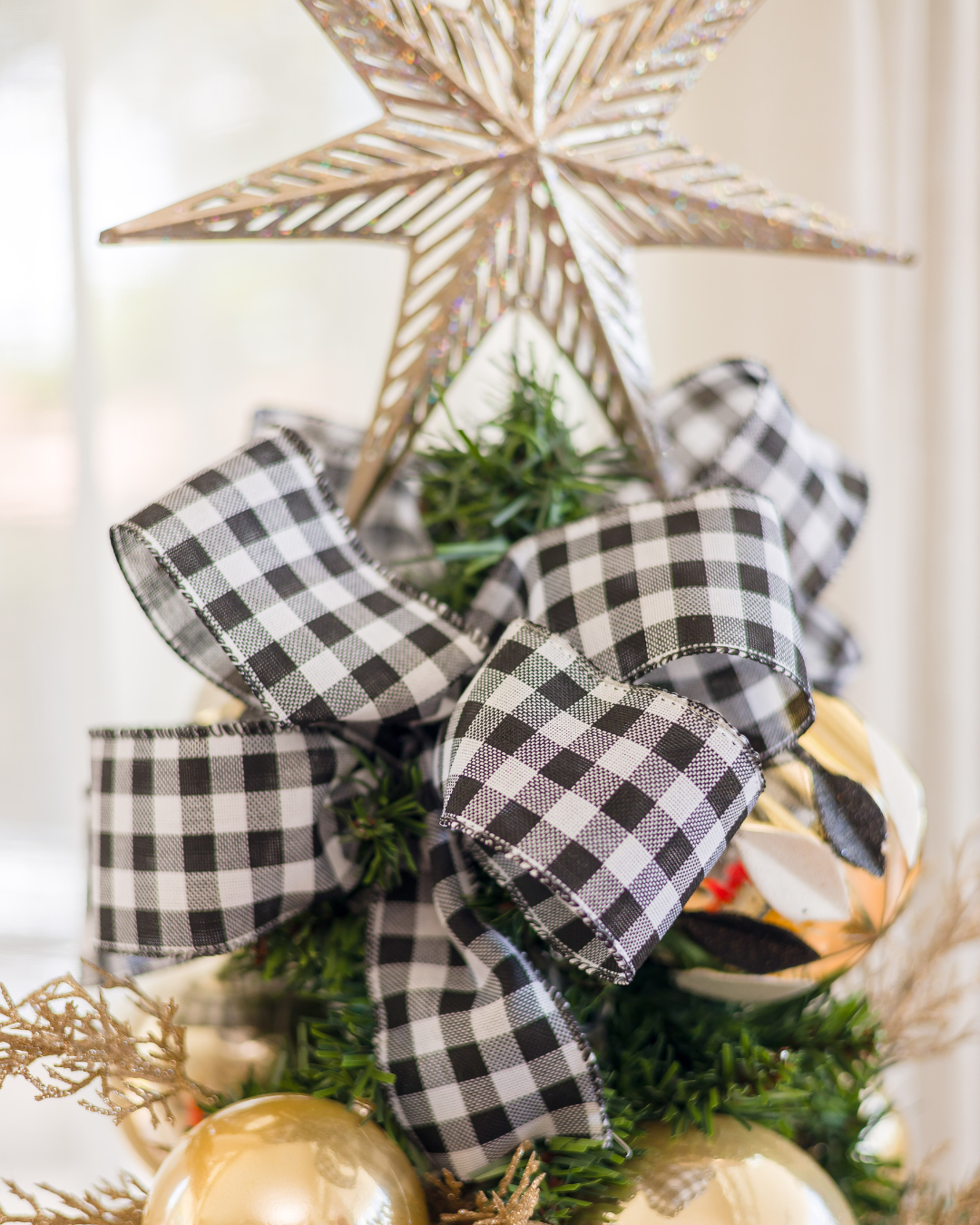 Decorada com laços em padrão xadrez, bolas douradas e folhagens brilhantes