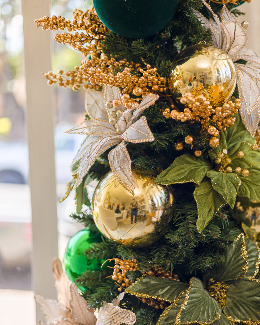 Seus enfeites cuidadosamente elaborados incluem bolas douradas e verdes aveludadas, folhagens detalhadas, flores em tons metálicos e ramos dourados que proporcionam um visual único e marcante. Com 1,8m de altura, é ideal para salas de estar, halls de entrada e espaços especiais que merecem destaque durante as festas.