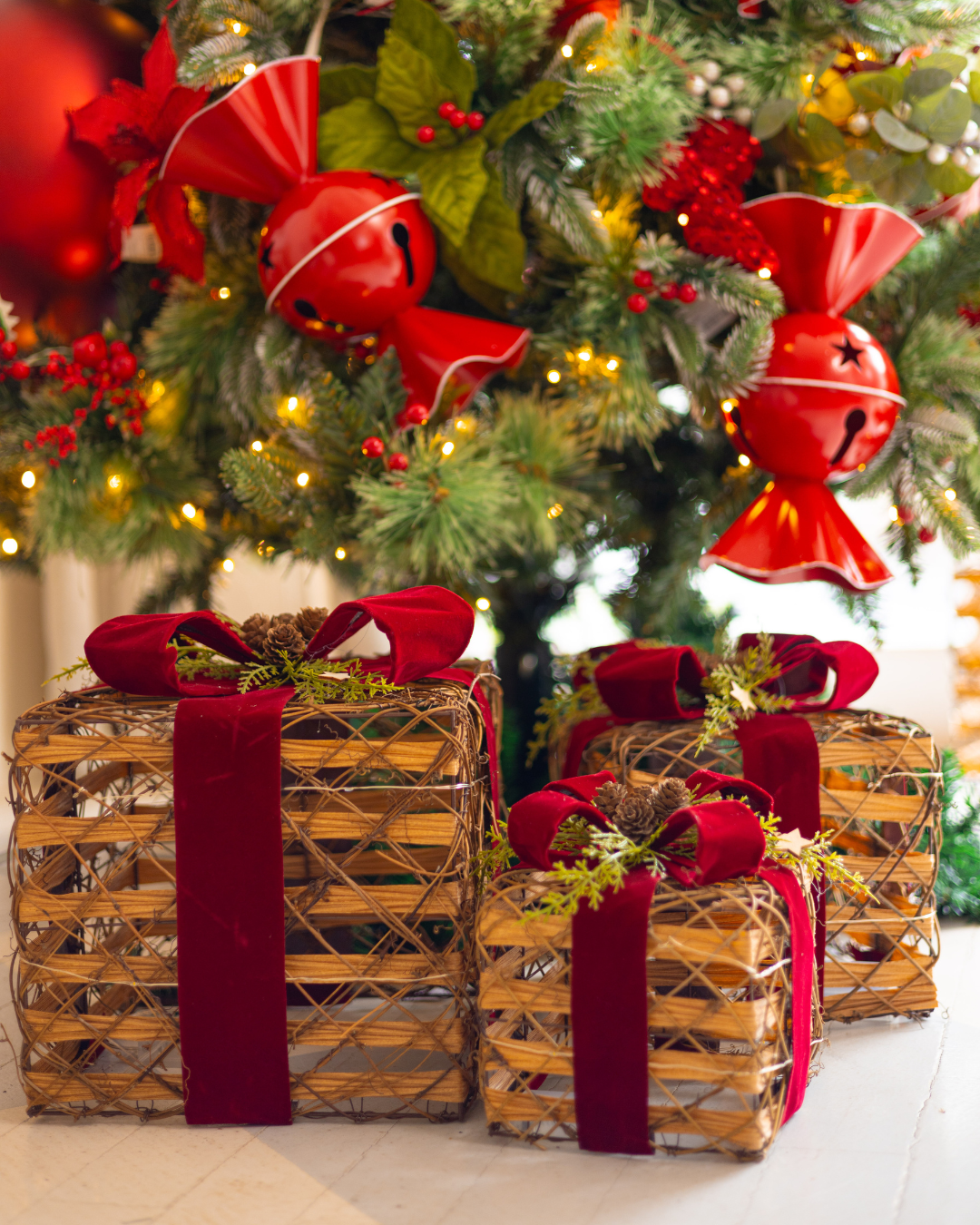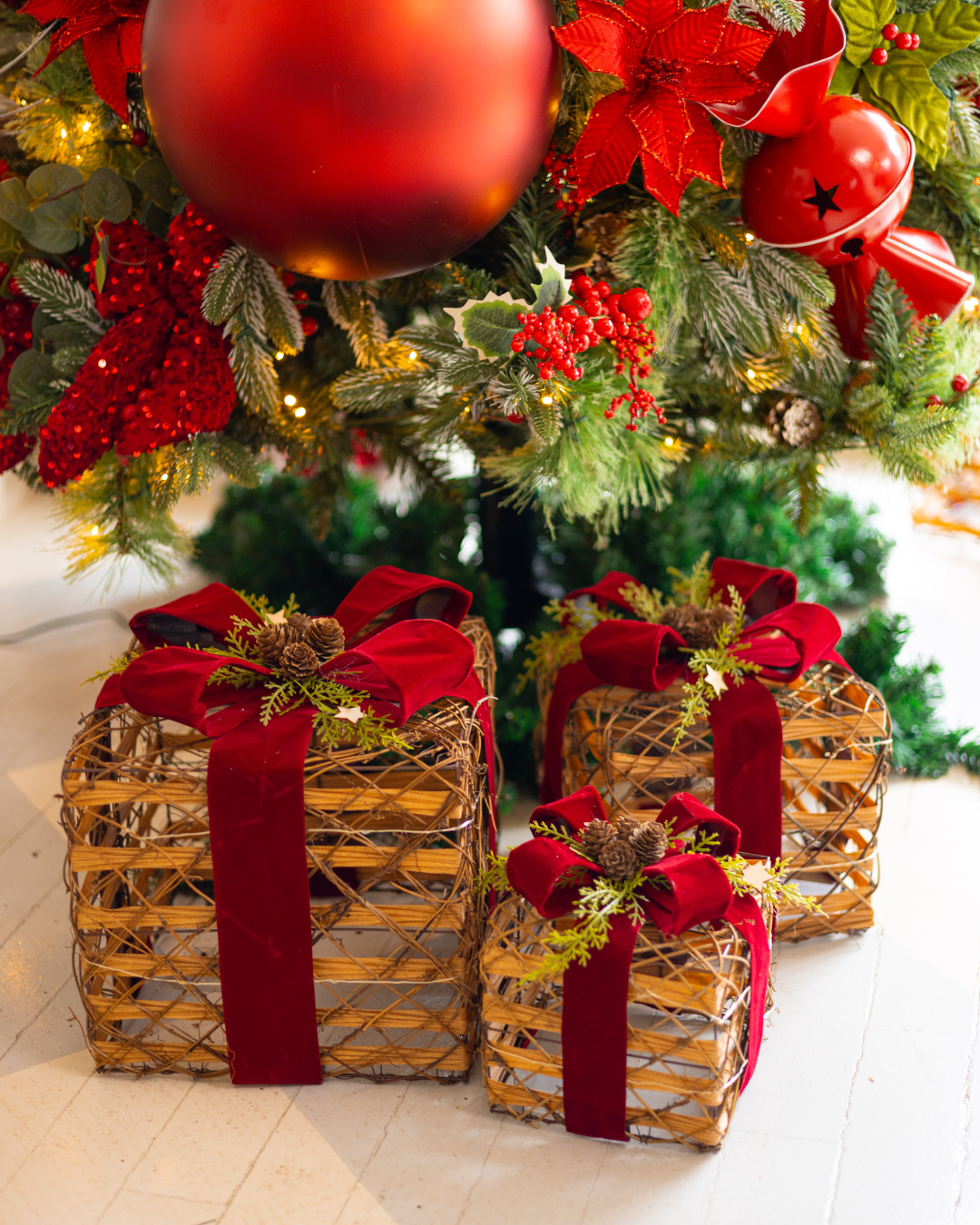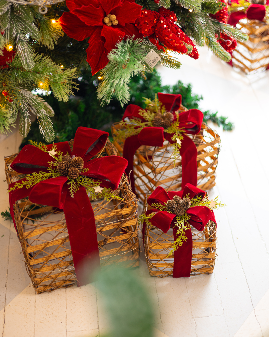 Encante sua decoração com o brilho e a elegância deste conjunto de 3 caixas de presentes natalinos com LED. Produzidas em estrutura rústica trançada e adornadas com fitas de veludo vermelho, elas trazem o charme natural dos materiais e o toque sofisticado da iluminação suave.
