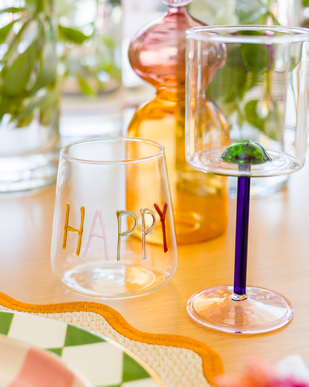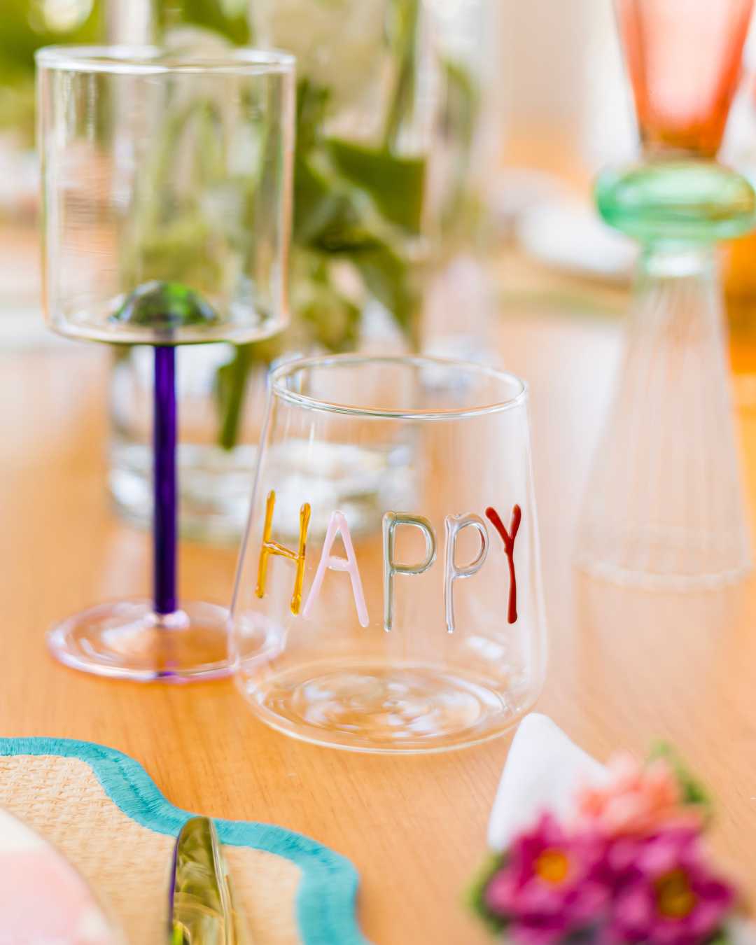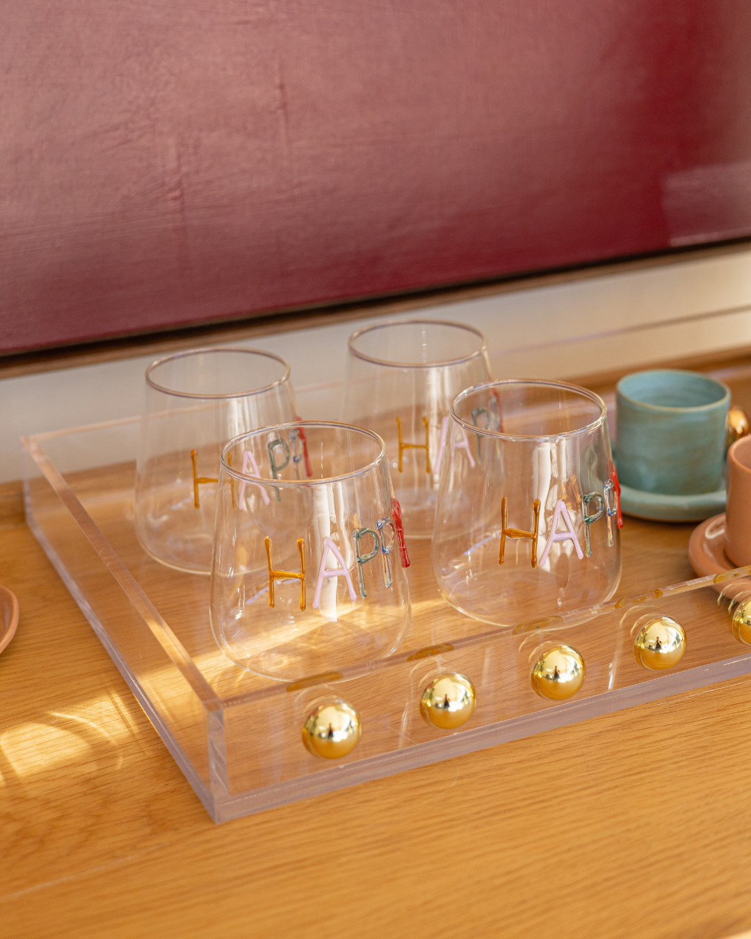 Fabricado em vidro borossilicato de alta qualidade, este copo é leve, resistente a choques térmicos e possui transparência impecável. A palavra “HAPPY” é aplicada em alto-relevo com acabamento colorido, criando uma composição divertida e expressiva.