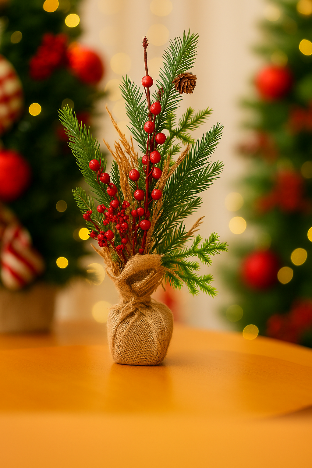 Decorada com galhos de pinho, frutinhos vermelhos, pinhas naturais e acabamento em juta, a árvore transmite a essência do Natal de forma elegante e acolhedora. Seu tamanho compacto permite fácil combinação com outros enfeites e composições, sem perder o destaque.