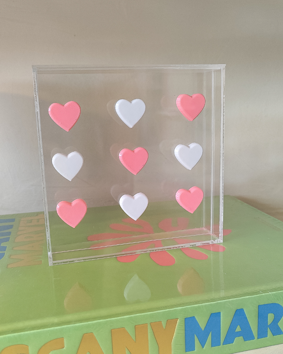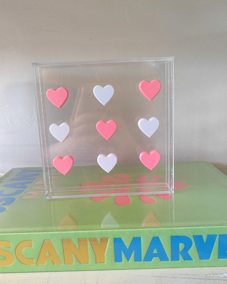 Com estética pop romântica e acabamento contemporâneo, essa peça é perfeita para criar composições afetivas em nichos, estantes ou mesas decorativas. O jogo de cores suaves e a repetição dos corações formam uma arte visualmente encantadora, que transmite leveza e alegria.