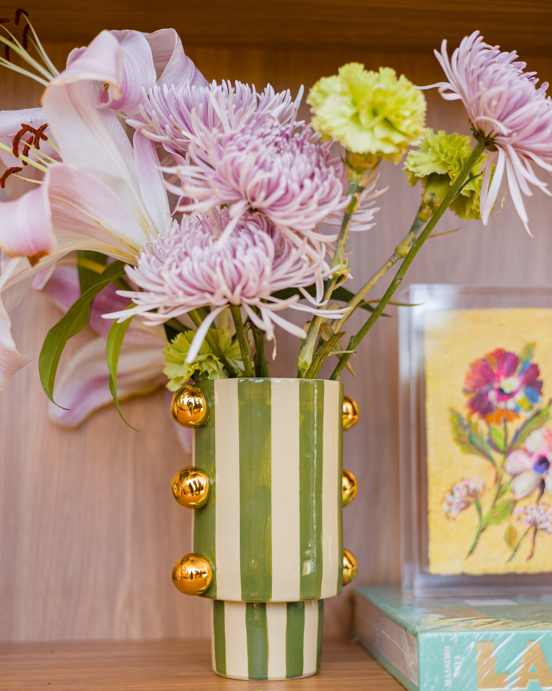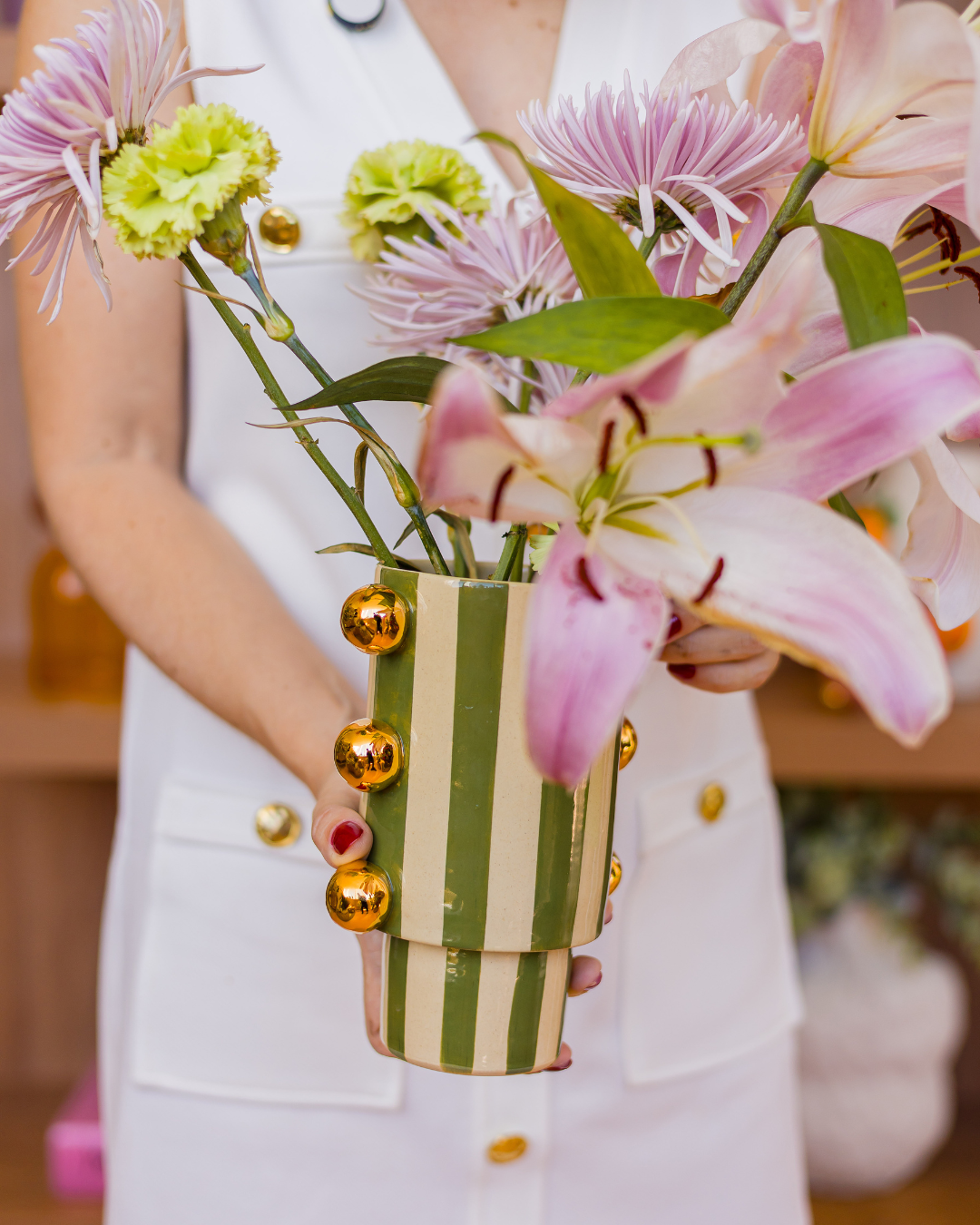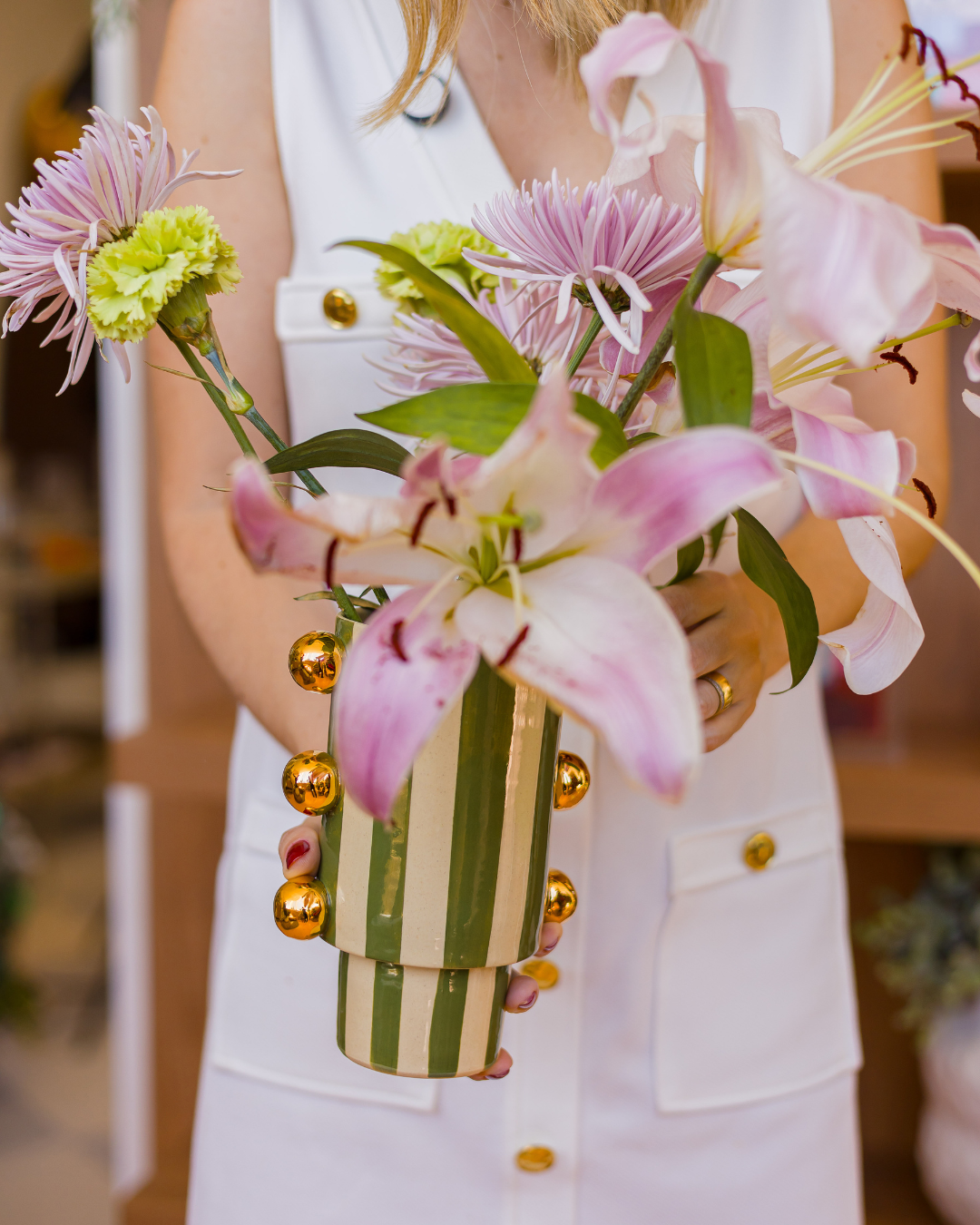 O Vaso Giu Listrado com Ouro Verde é uma peça de design marcante, que combina o charme artesanal da cerâmica com um toque contemporâneo de cor e brilho. Suas listras verticais em verde e off-white criam um visual elegante e descontraído, enquanto as esferas douradas aplicadas acrescentam sofisticação e originalidade à composição.