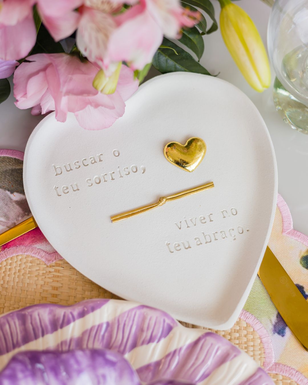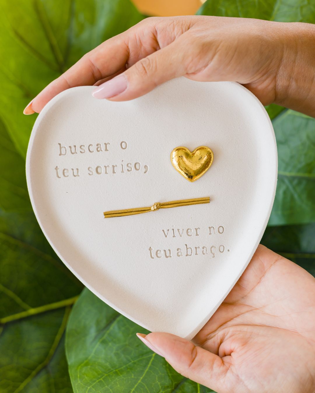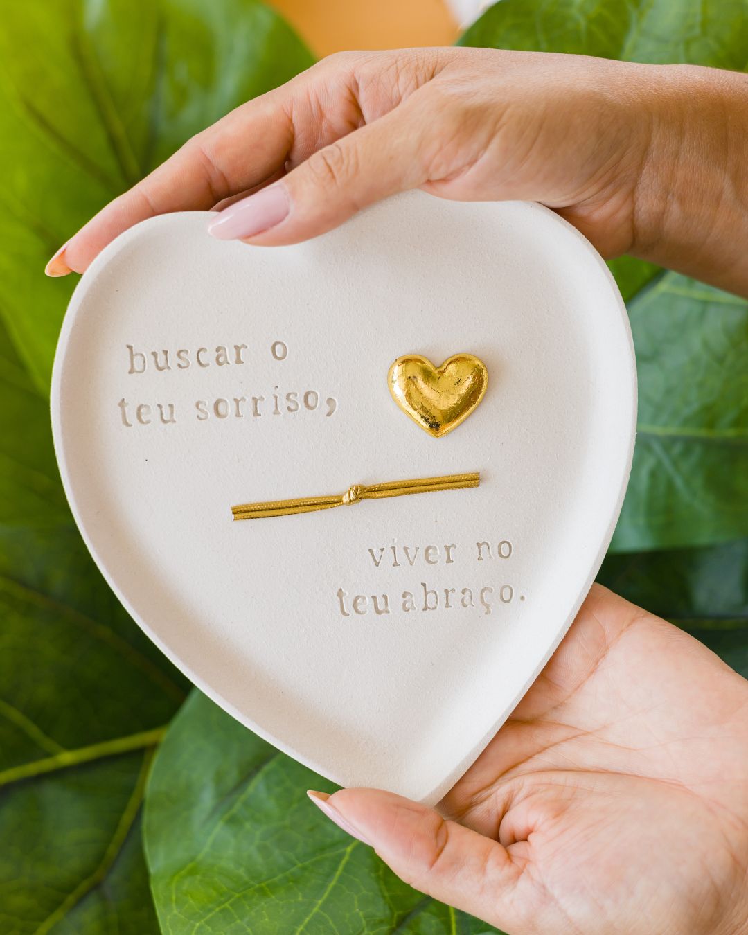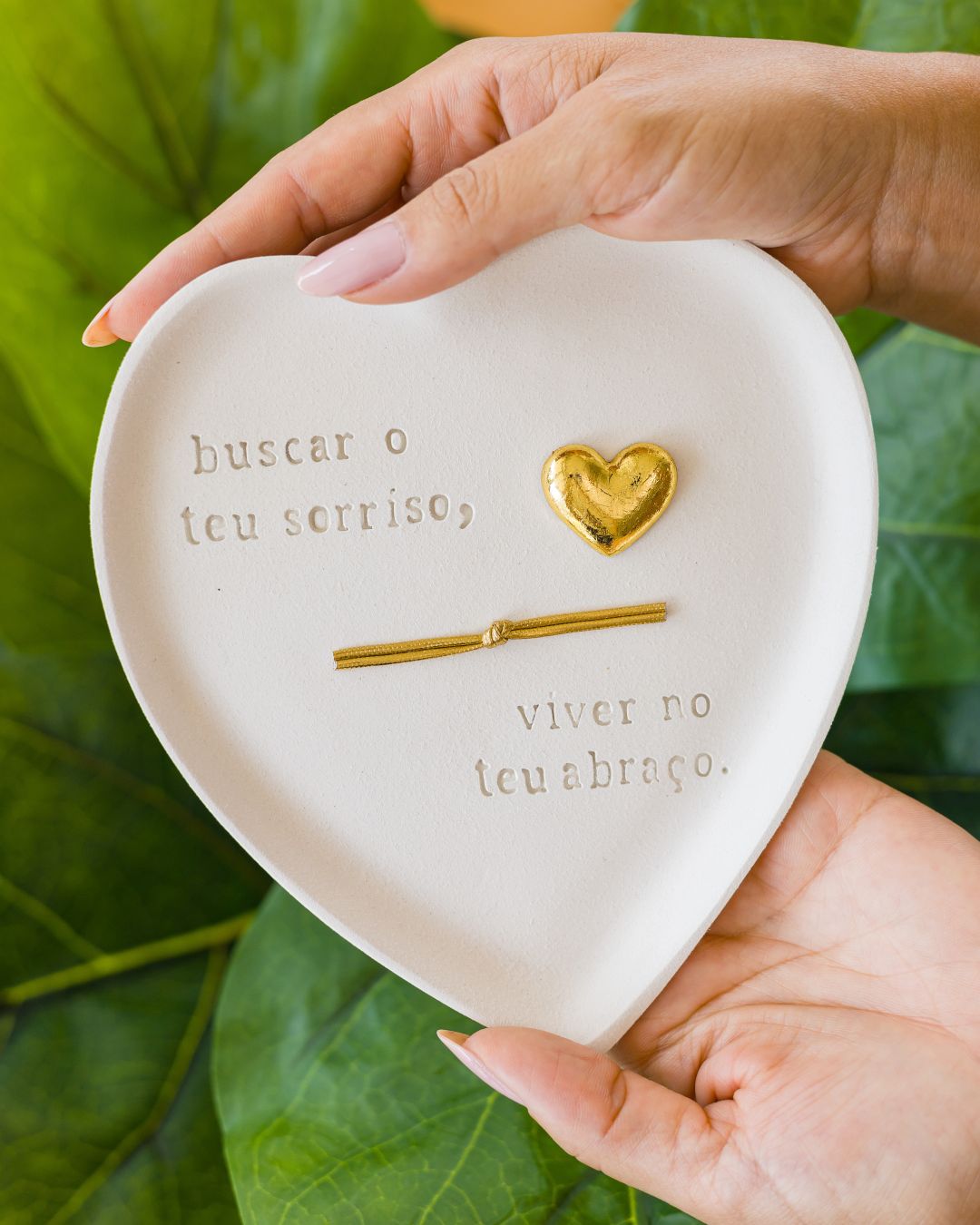 Com formato de coração e acabamento fosco, a peça apresenta a frase distribuída em dois lados, criando uma composição visual equilibrada e envolvente. O destaque fica por conta do coração dourado central e do delicado fio metálico com nó, simbolizando a união, o vínculo e a continuidade de um sentimento que se completa.