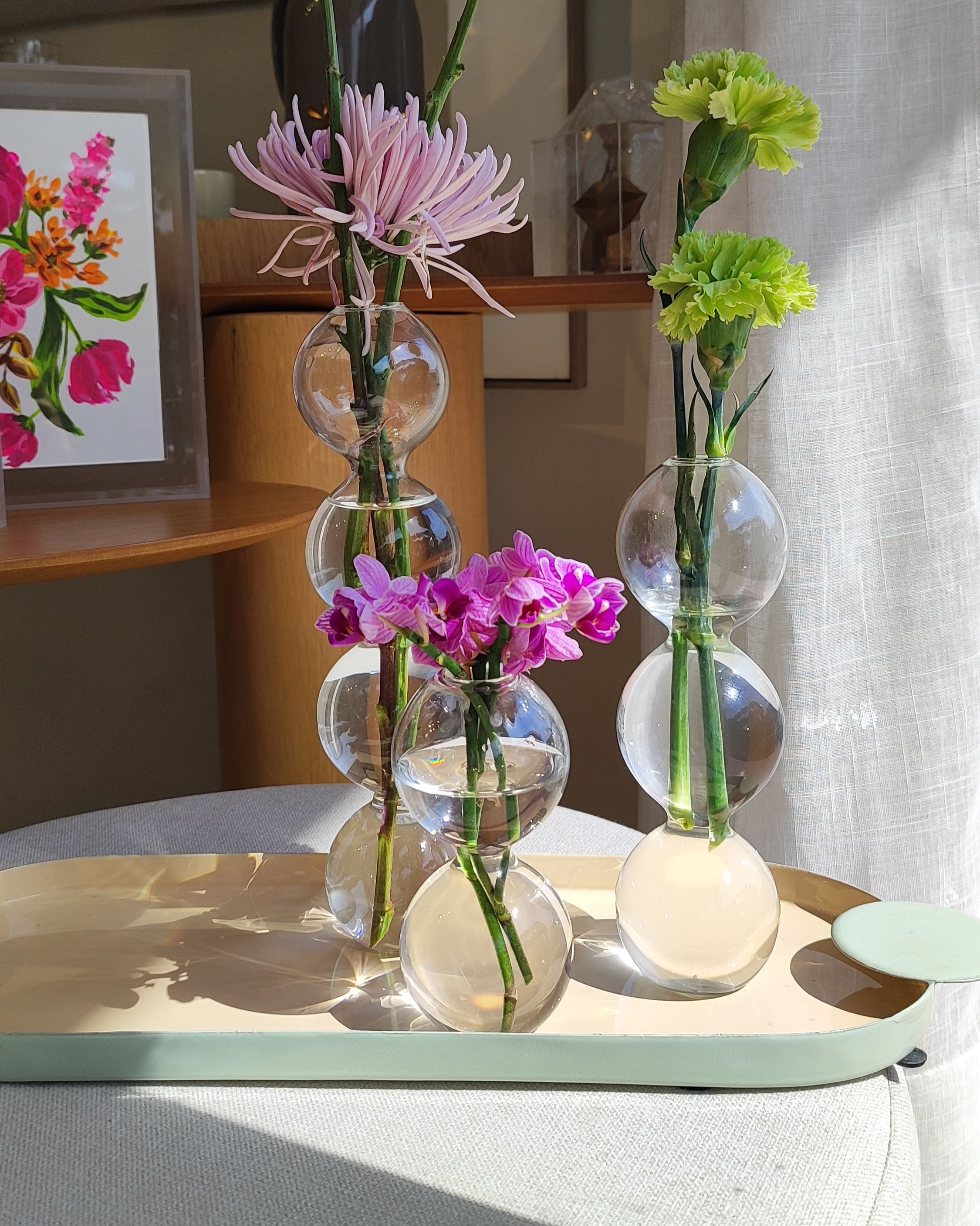 Delicados e contemporâneos, os Vasos Esféricos de Vidro encantam pela leveza e pelo design orgânico. O conjunto com três peças em diferentes alturas cria composições elegantes e cheias de movimento, valorizando o brilho natural da luz e o frescor das flores.