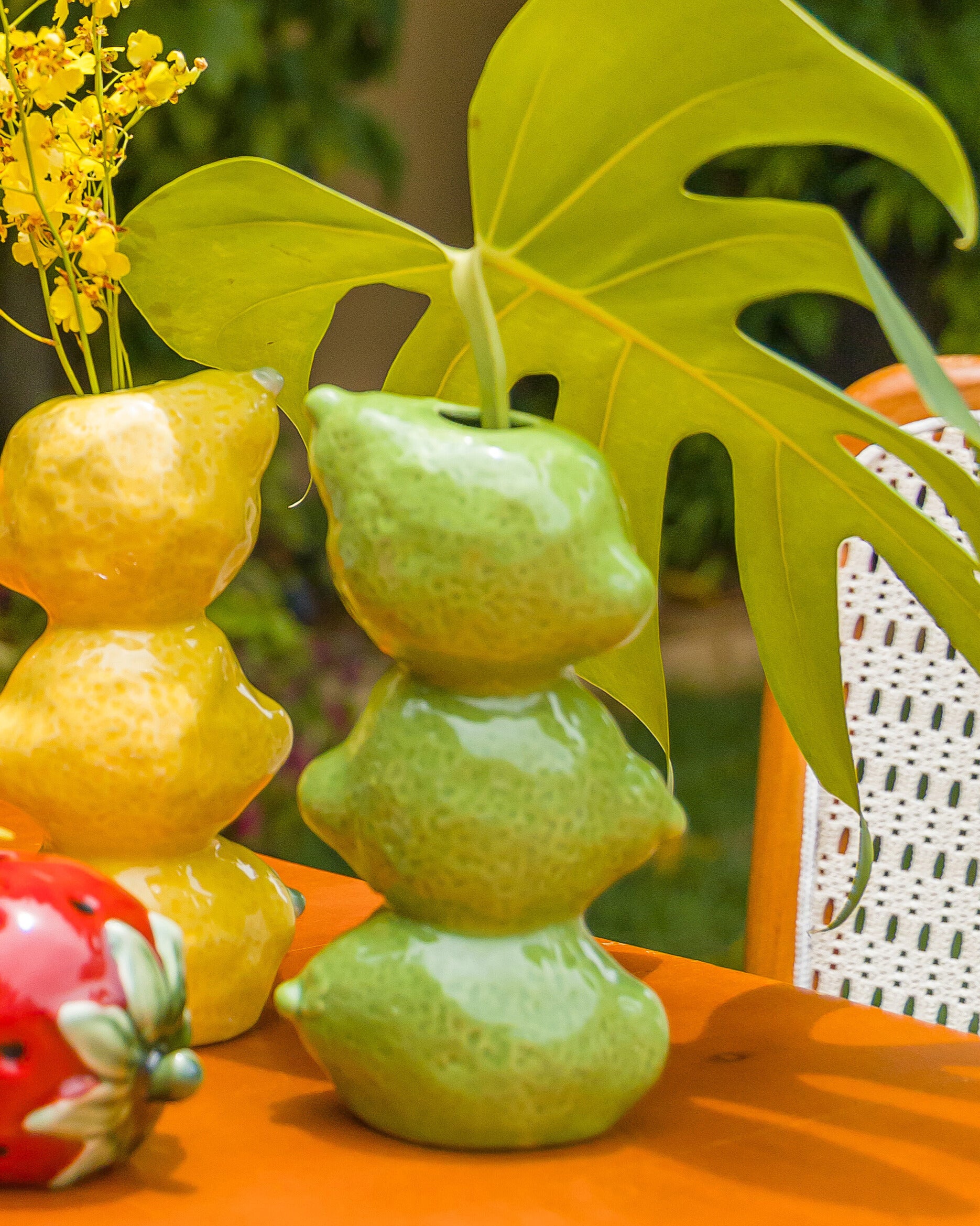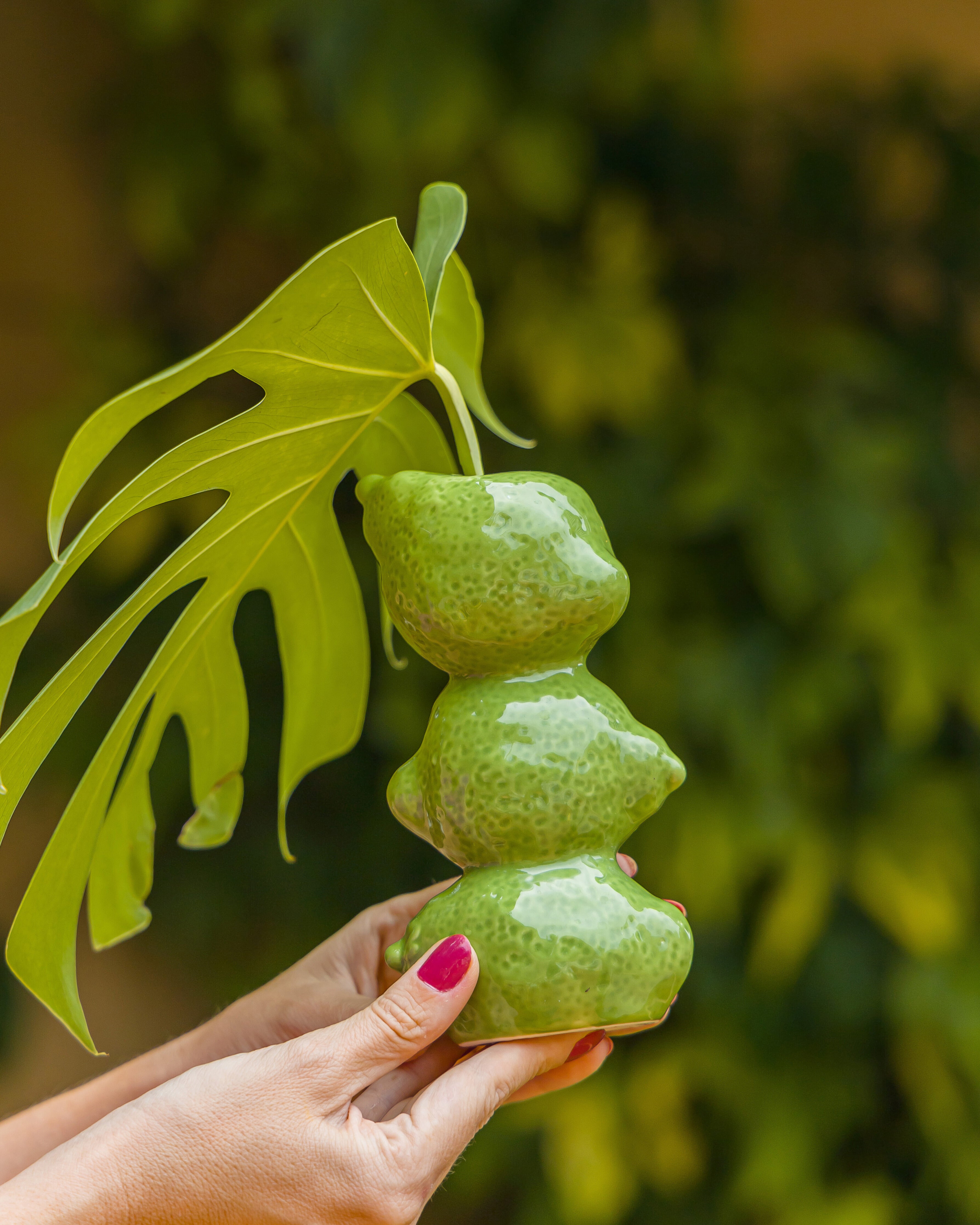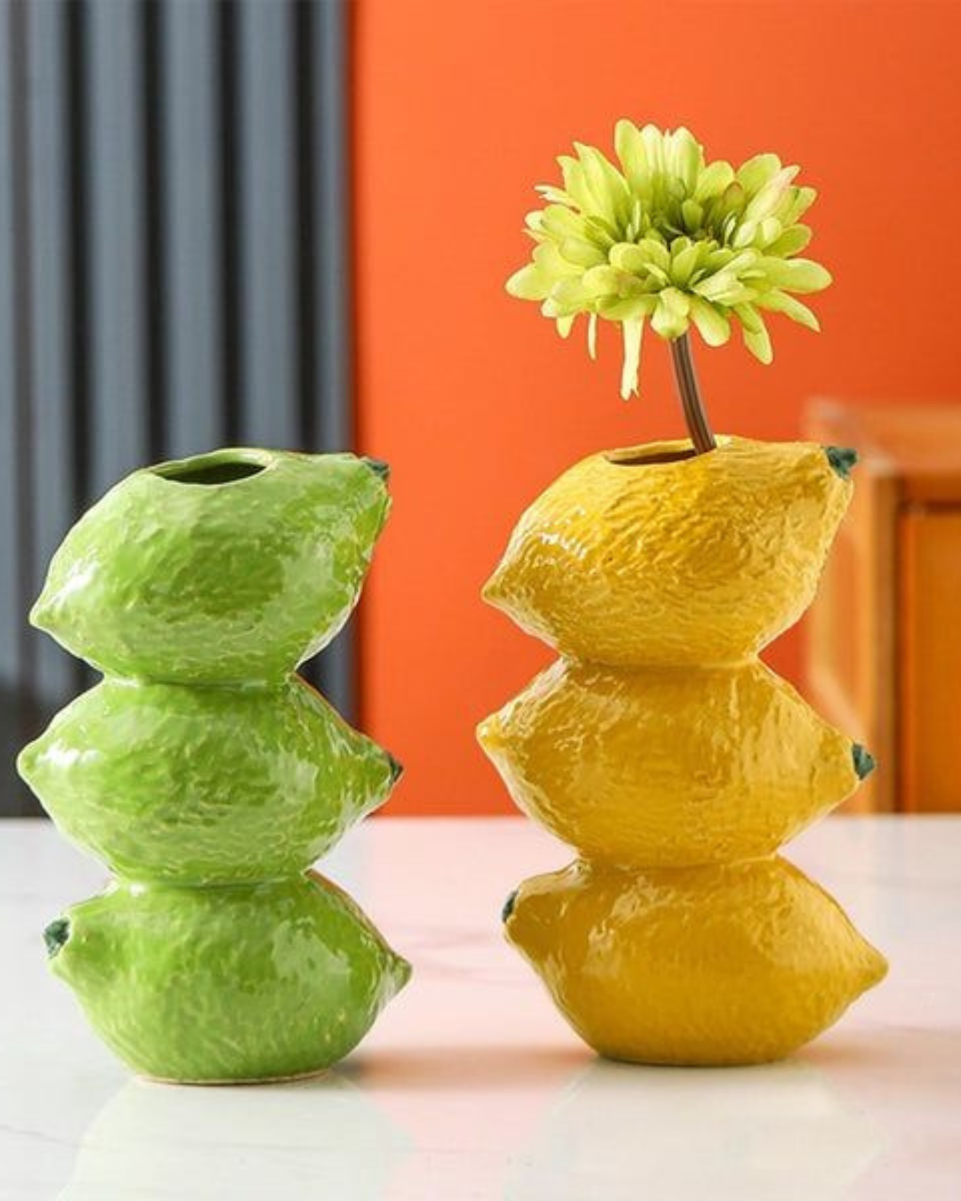 • Design: O formato tridimensional de três limões empilhados dá ao vaso um apelo escultural e lúdico. A textura imita a superfície irregular da fruta, e a abertura superior discreta é perfeita para acomodar pequenas flores ou galhos secos.