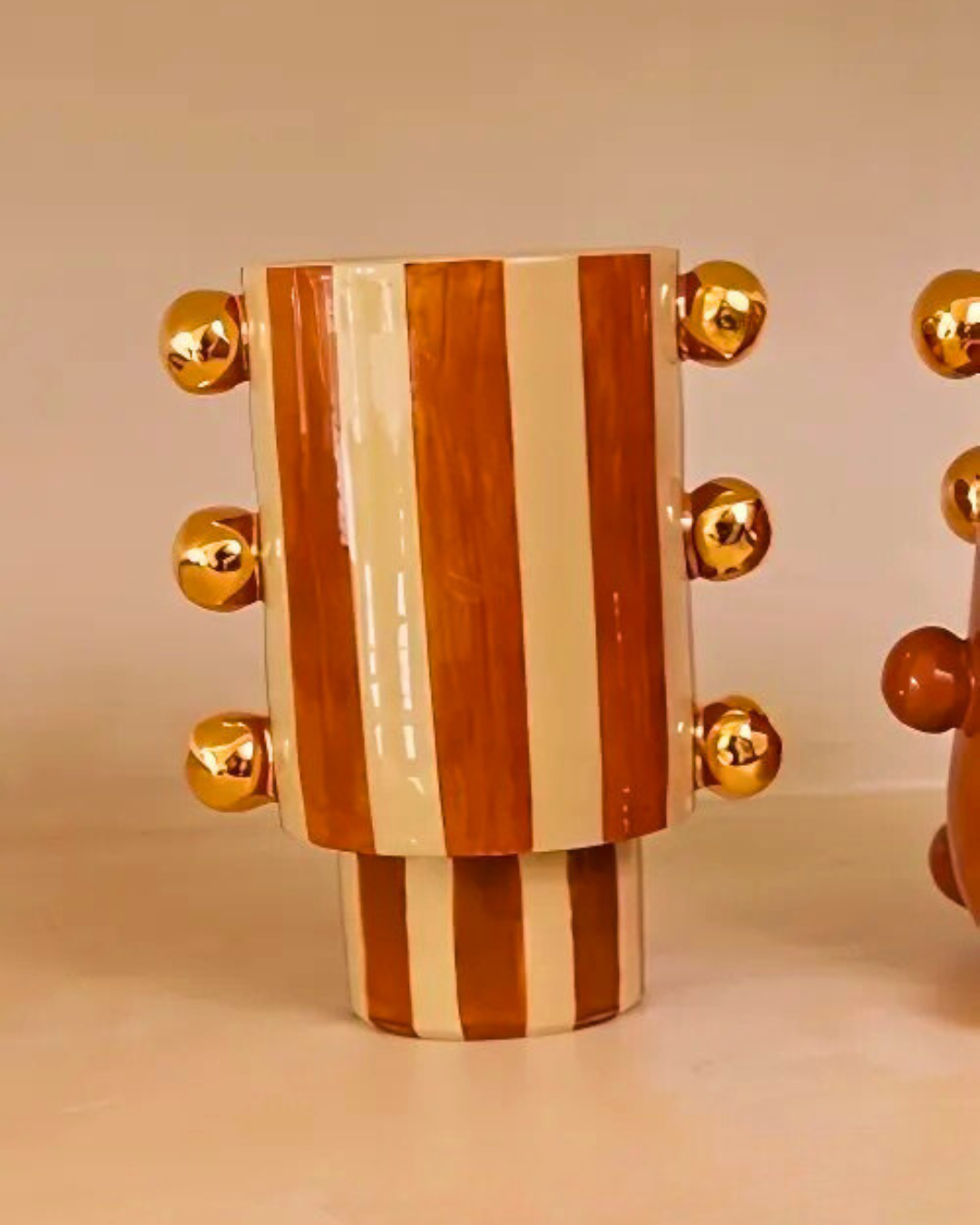 O design do Vaso Giu é ao mesmo tempo gráfico e divertido. Suas listras verticais em marrom e bege criam um contraste marcante, enquanto as esferas douradas nas laterais adicionam um toque glamouroso e inusitado. A base mais estreita realça sua estrutura escultural e proporciona estabilidade com elegância.