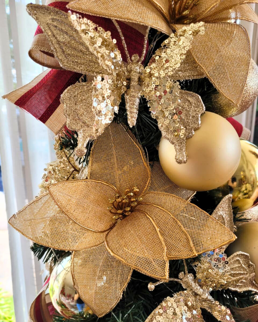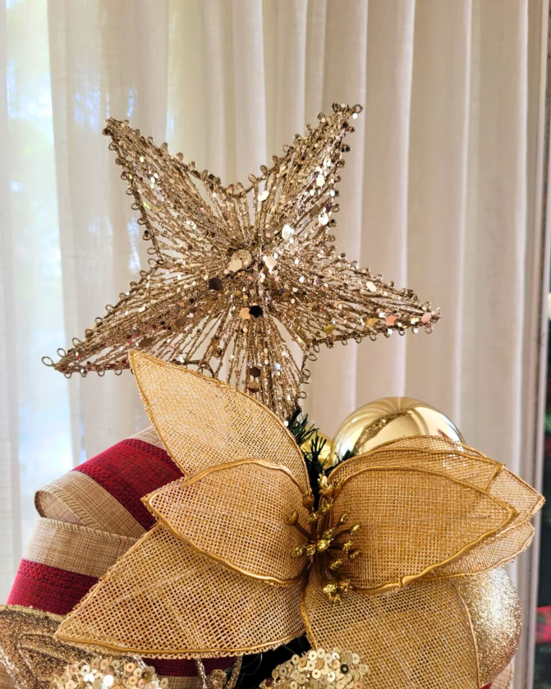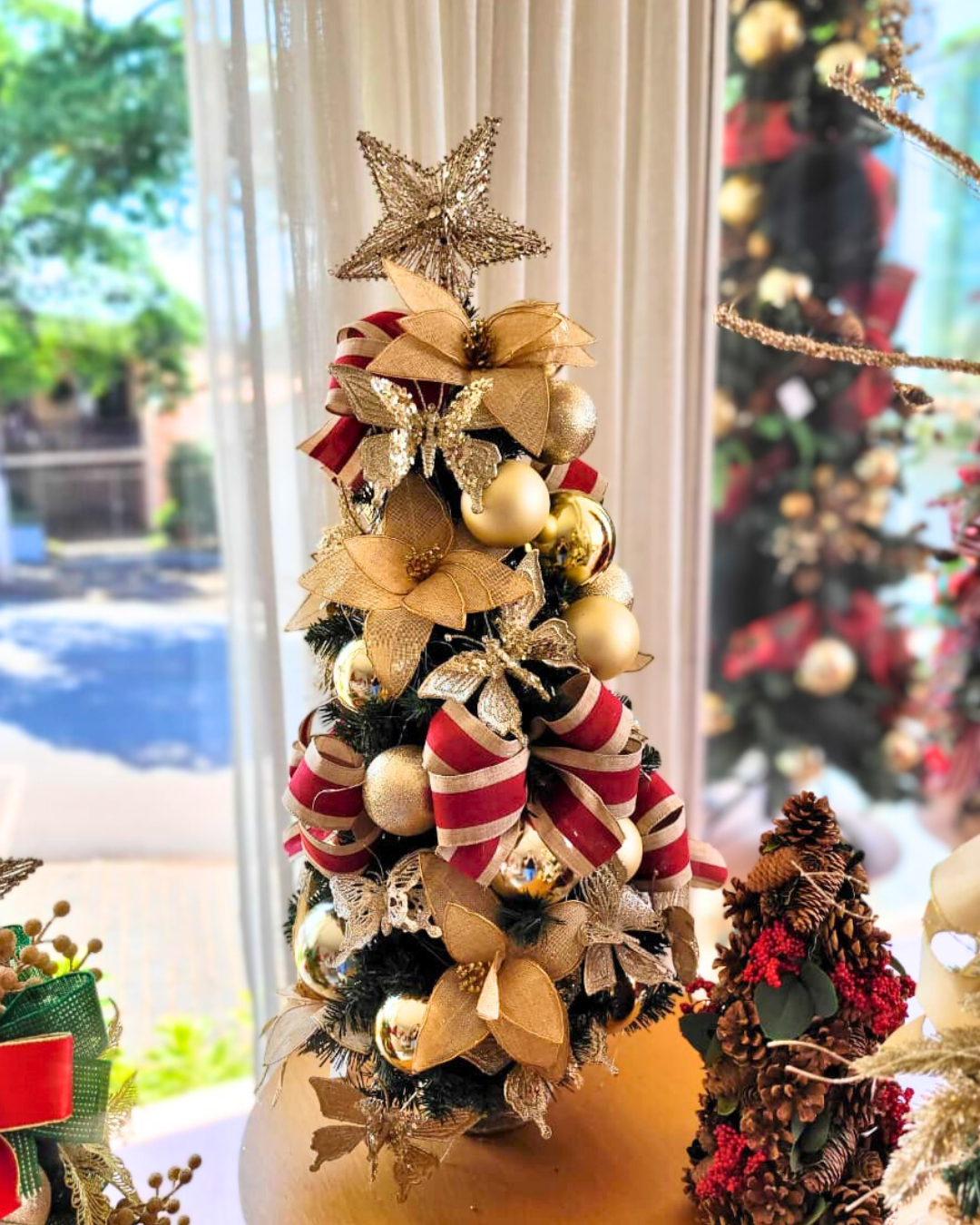 Ricamente decorada com flores douradas, laços em veludo vinho e detalhes em glitter, esta peça artesanal reflete o espírito natalino com requinte e harmonia. Seu topo é finalizado com uma estrela cintilante, que completa o visual clássico e festivo.