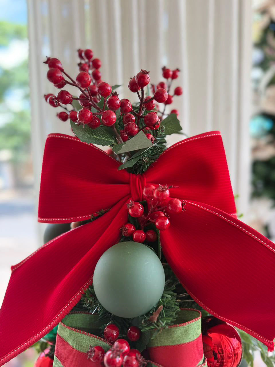 A Árvore de Natal Greenberry combina o encanto clássico do vermelho e verde com um toque moderno e vibrante. Decorada com laços de veludo, esferas em tons foscos e brilhantes e ramos com frutinhos natalinos, ela traz o equilíbrio perfeito entre tradição e frescor.