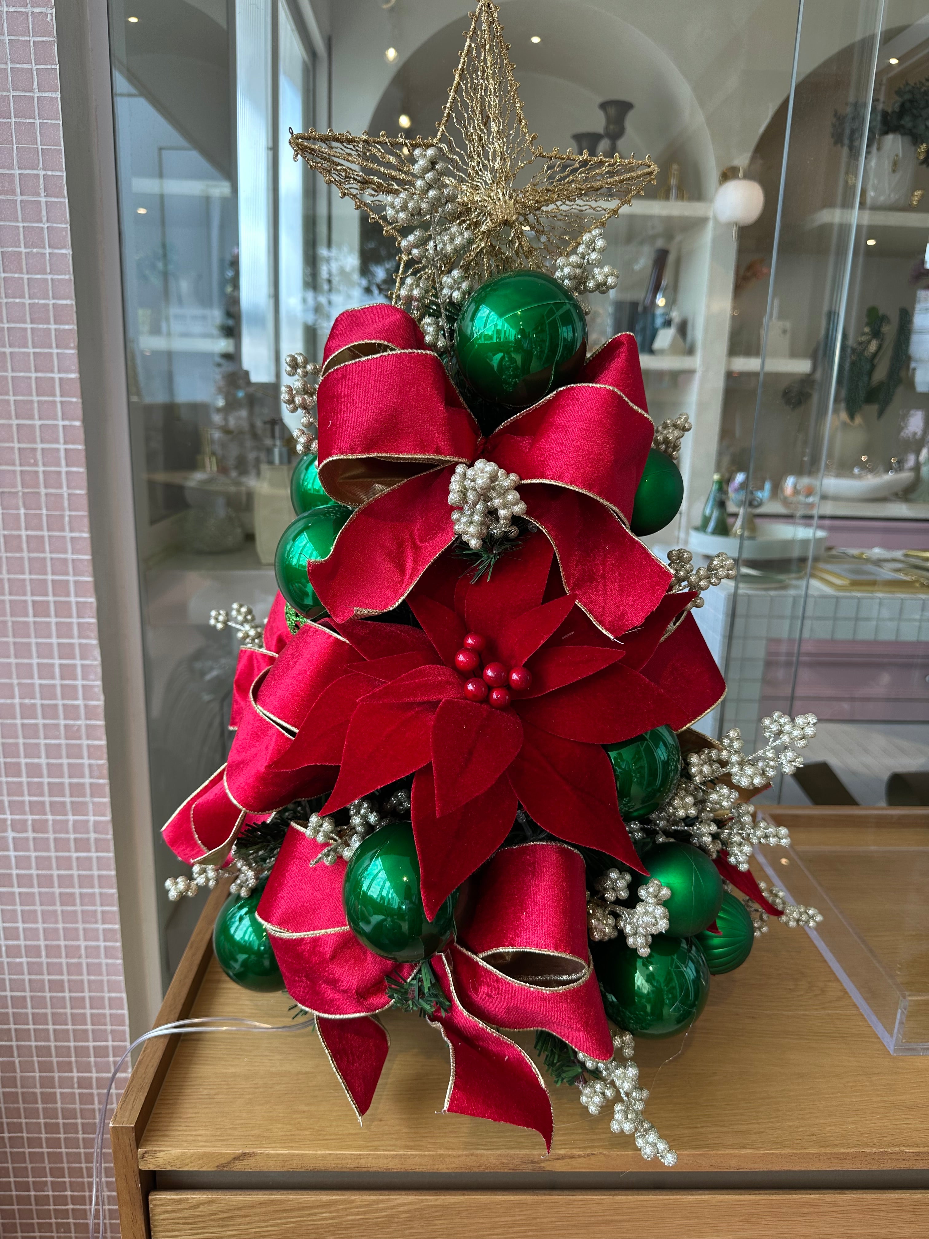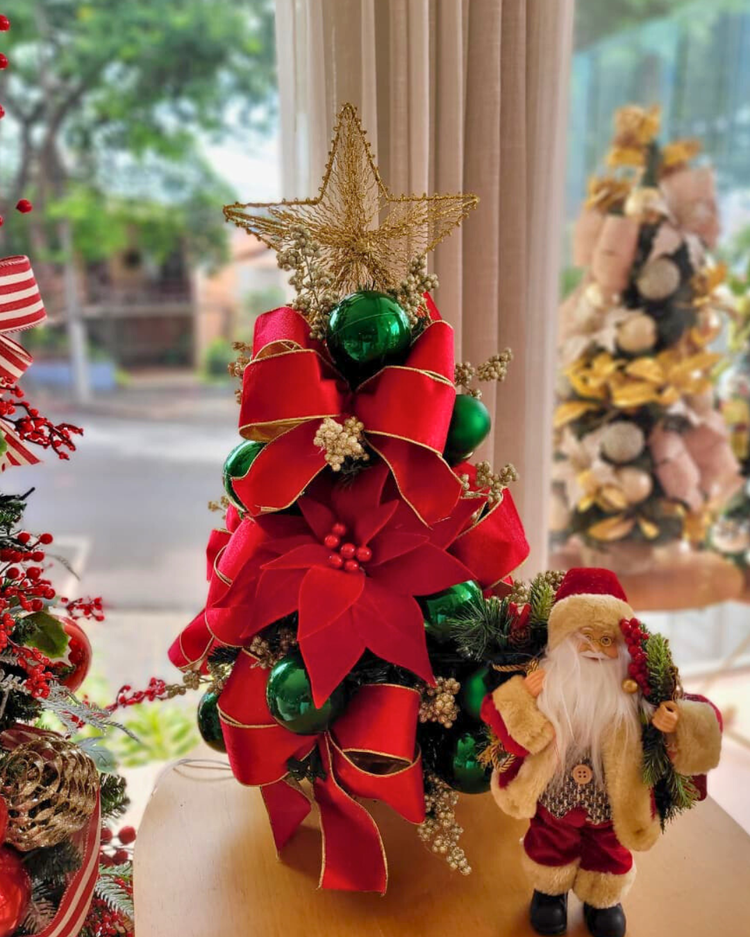 O destaque fica por conta da estrela dourada no topo, que acrescenta um toque de luz e sofisticação à composição, tornando-a ideal para mesas, aparadores e ambientes que pedem um charme festivo.