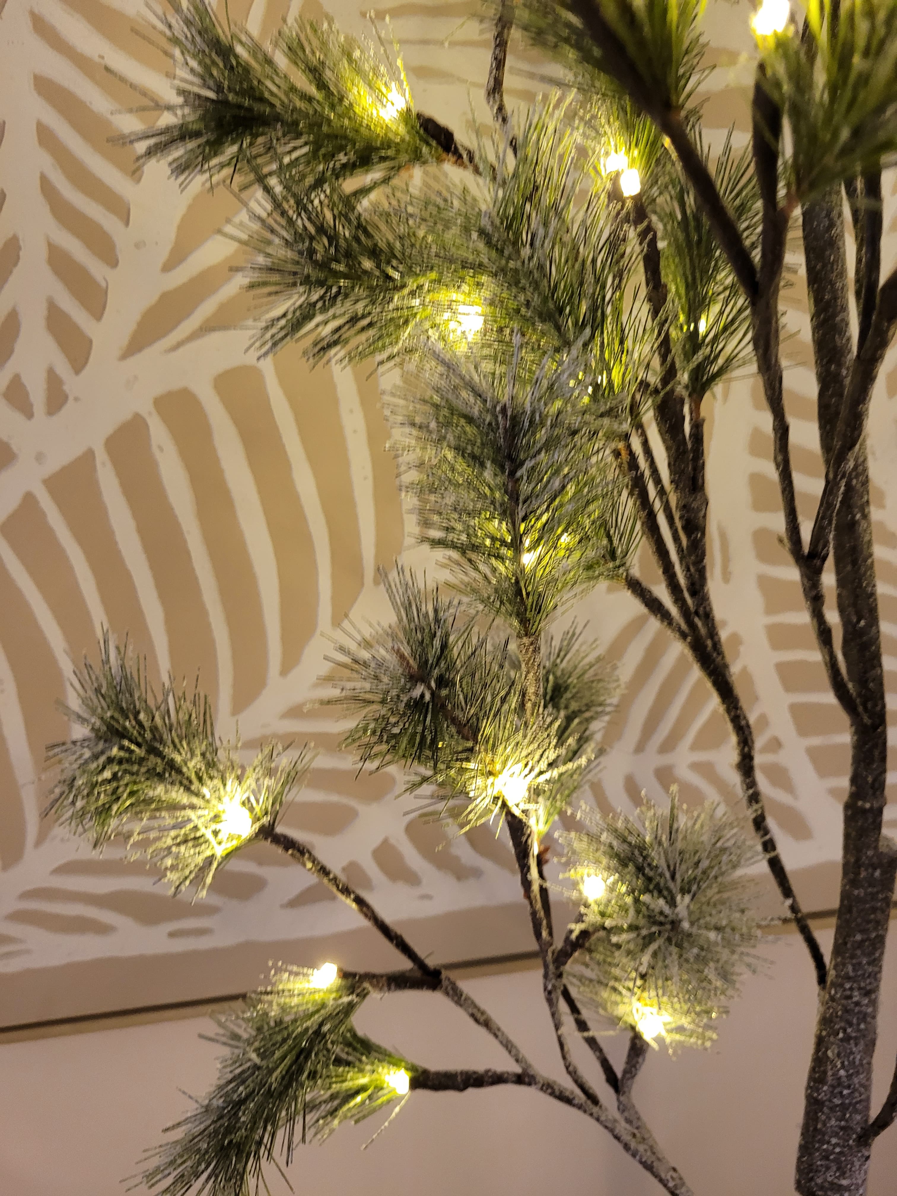 - Design: Galhos com folhas delicadas e iluminação embutida