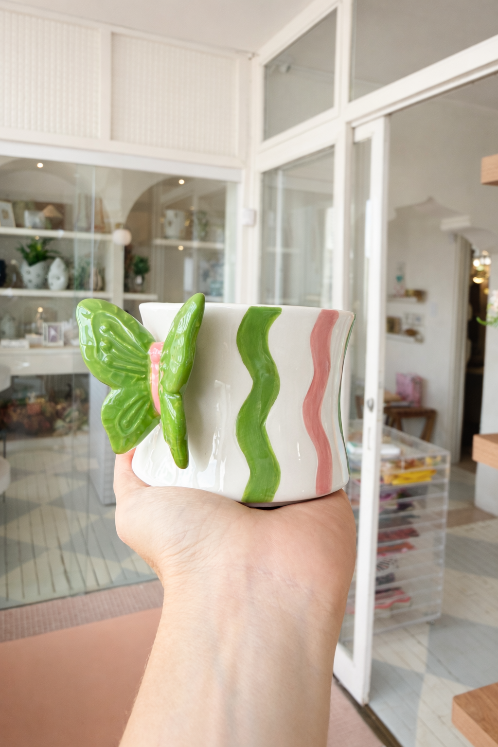 O grande destaque fica por conta da borboleta em alto-relevo na lateral, que adiciona textura, movimento e um toque lúdico sofisticado à composição. A parte interna em tom suave complementa a estética da peça, tornando-a perfeita para compor mesas criativas ou cantinhos de café cheios de estilo.