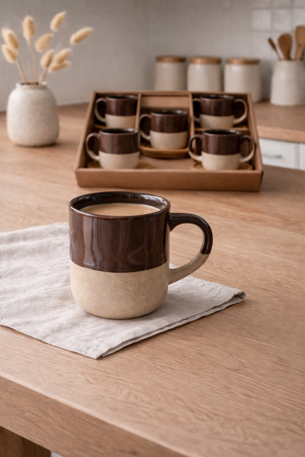 Com design atemporal e estética acolhedora, este conjunto de xícaras em cerâmica esmaltada marrom foi pensado para valorizar os pequenos rituais do dia a dia. O acabamento esmaltado traz profundidade à cor e um toque artesanal, criando uma peça elegante e versátil para diferentes estilos de mesa.