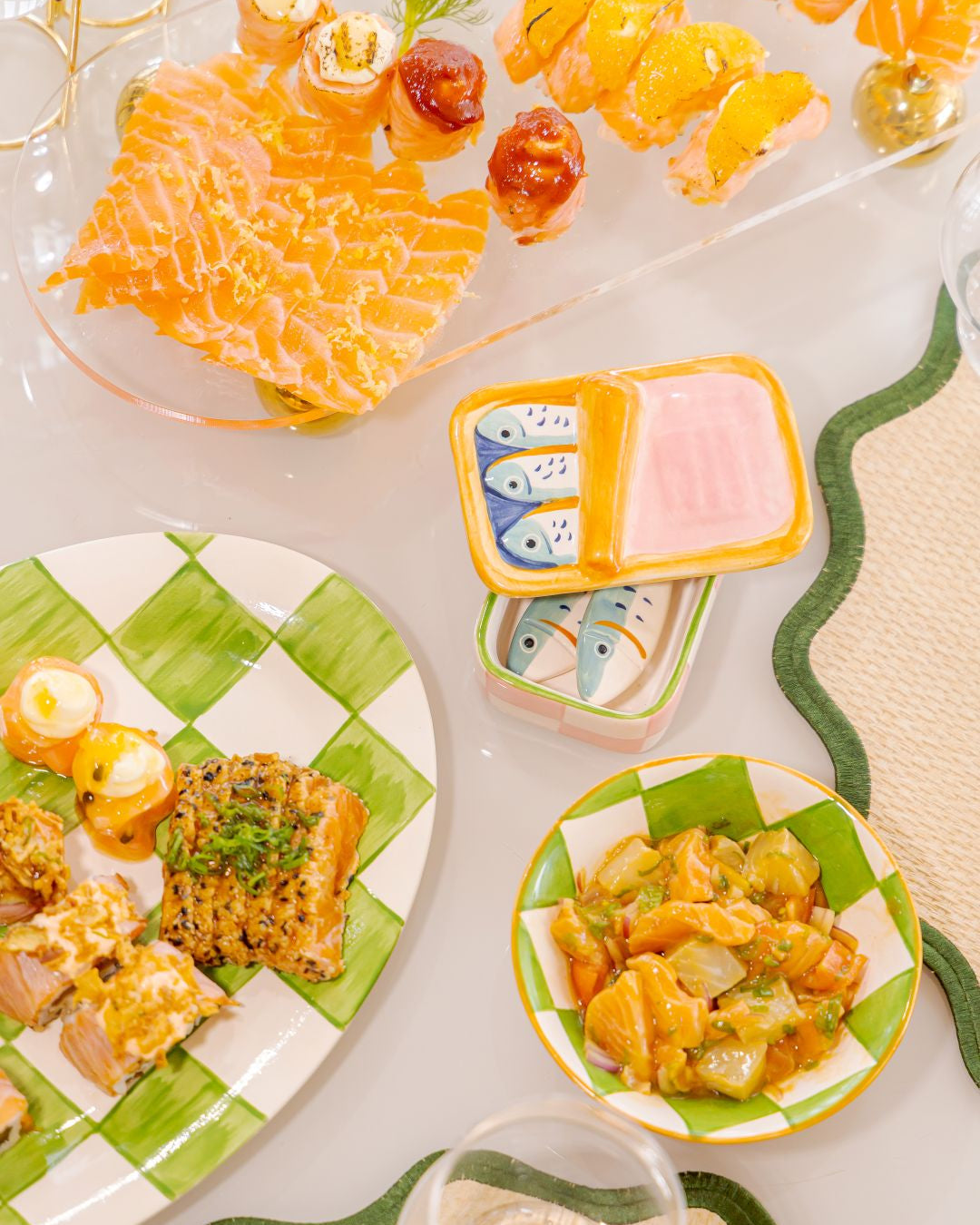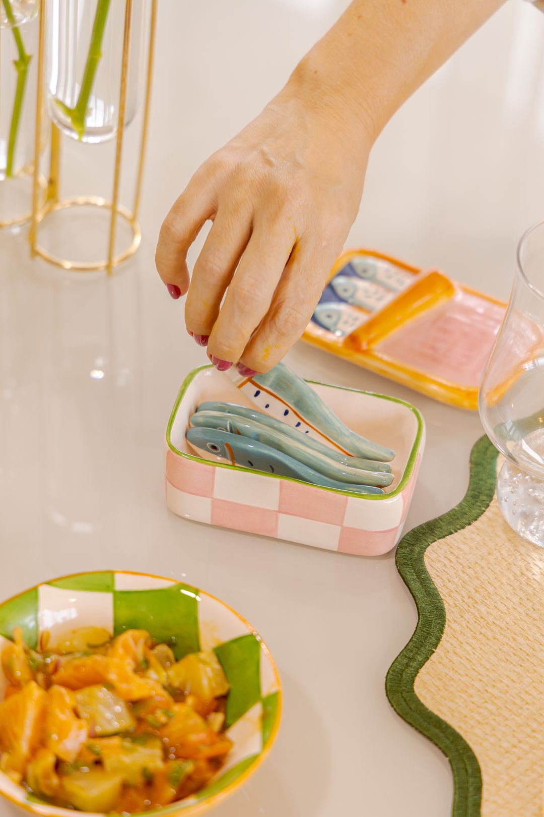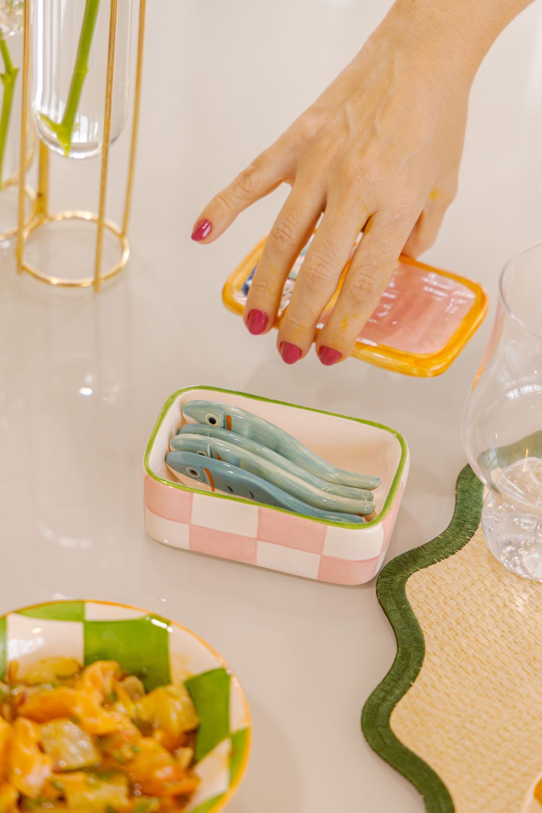 O Kit Peixe Marinho é uma composição encantadora que une organização, funcionalidade e um design artesanal cheio de personalidade. Produzido em cerâmica, o kit traz uma caixinha decorativa em tons de rosa, azul e laranja, acompanhada de 4 porta hashi em formato de peixe, que remetem ao universo marinho com leveza e charme.