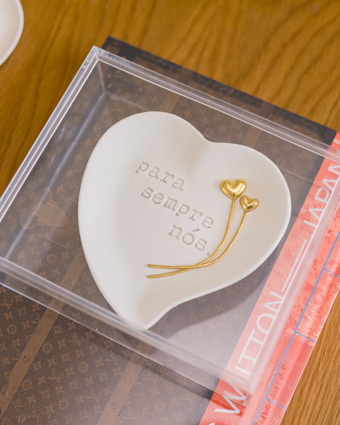 Com formato de coração e acabamento fosco, a peça traz a frase em relevo suave, acompanhada de dois corações dourados interligados por delicados fios metálicos, representando a conexão entre duas histórias que caminham juntas. A composição ganha ainda mais destaque ao ser apresentada em uma elegante caixa acrílica transparente, que protege e valoriza o design.