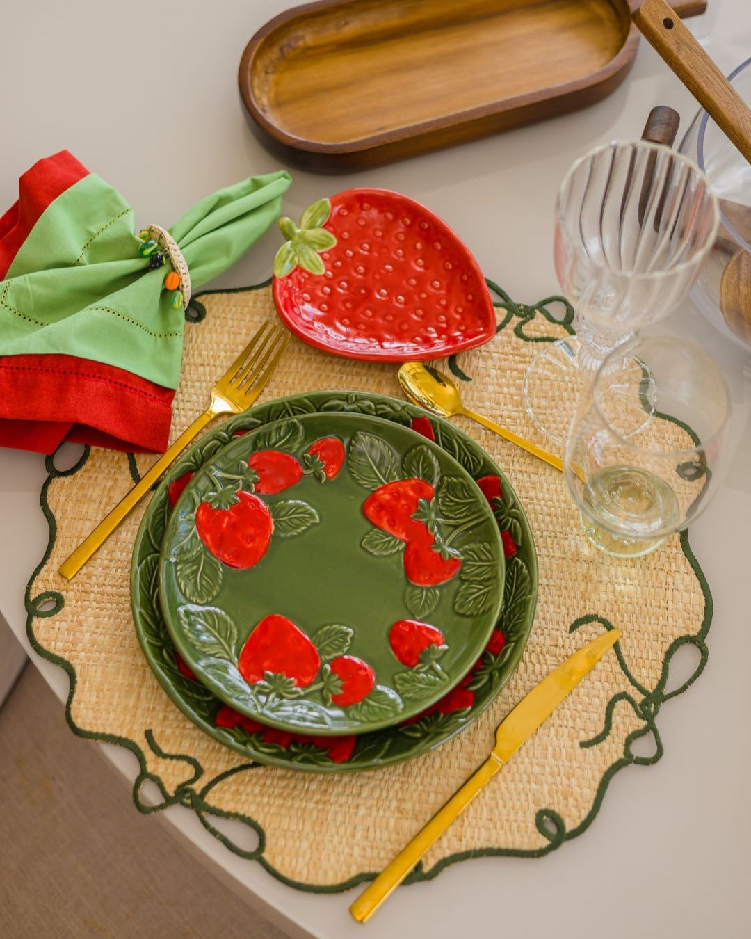Com inspiração na estética natural dos morangos, o prato combina o verde intenso das folhas com detalhes em relevo de frutas em vermelho vibrante, criando uma composição rica em texturas e cores. O design orgânico e delicado traz um toque artesanal e acolhedor, perfeito para mesas que valorizam charme e originalidade.