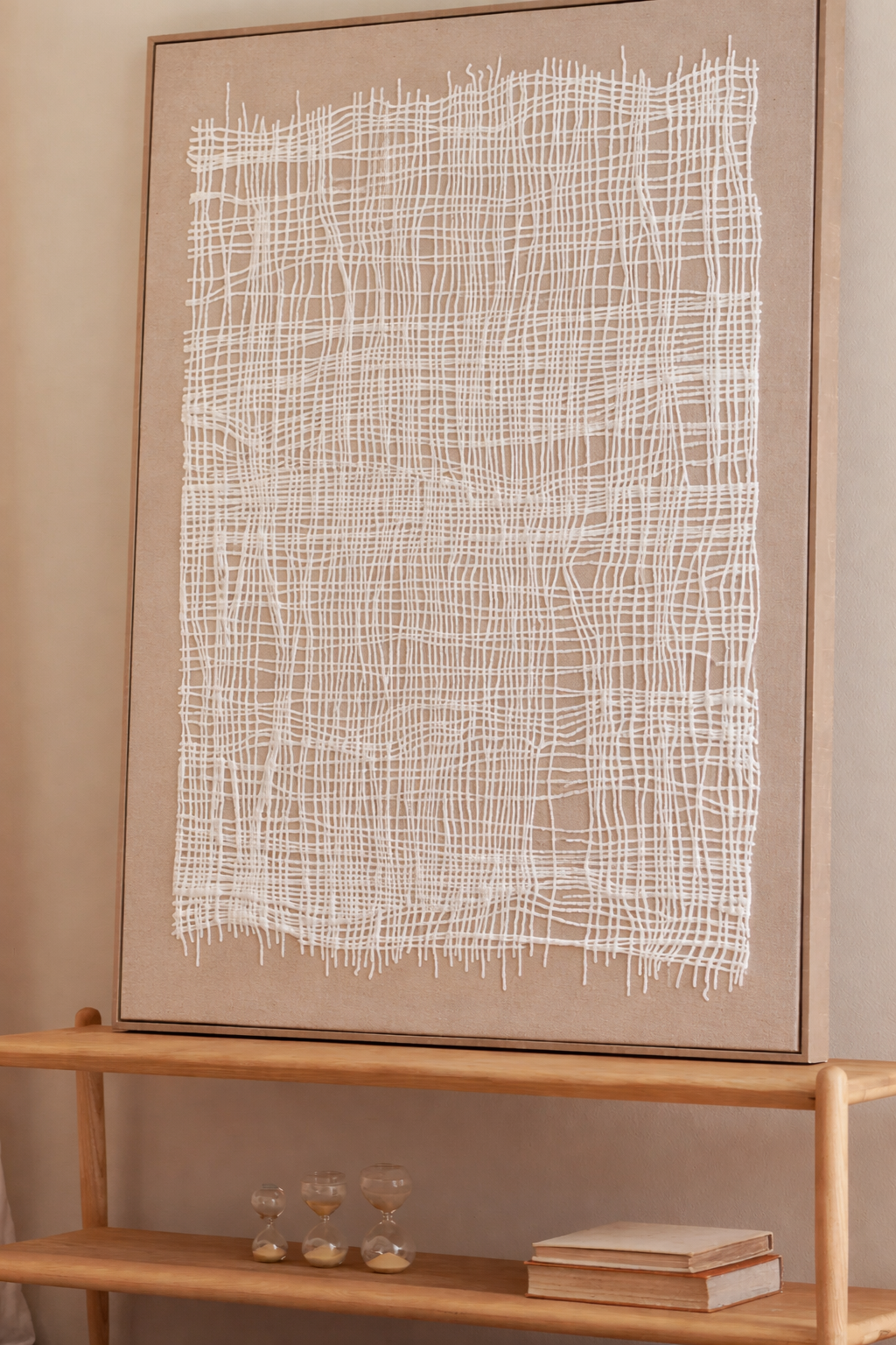 Este quadro abstrato traz um toque contemporâneo e minimalista, com um fundo de linho natural que contrasta com linhas orgânicas em branco. A trama delicada das linhas remete a uma textura sutil, criando uma sensação de movimento e profundidade, ideal para ambientes modernos e sofisticados. O uso do linho como base adiciona uma qualidade texturizada à peça, que é ao mesmo tempo elegante e atemporal. Perfeito para destacar paredes em salas de estar, quartos ou escritórios, este quadro combina simplicidade e arte em um só elemento.