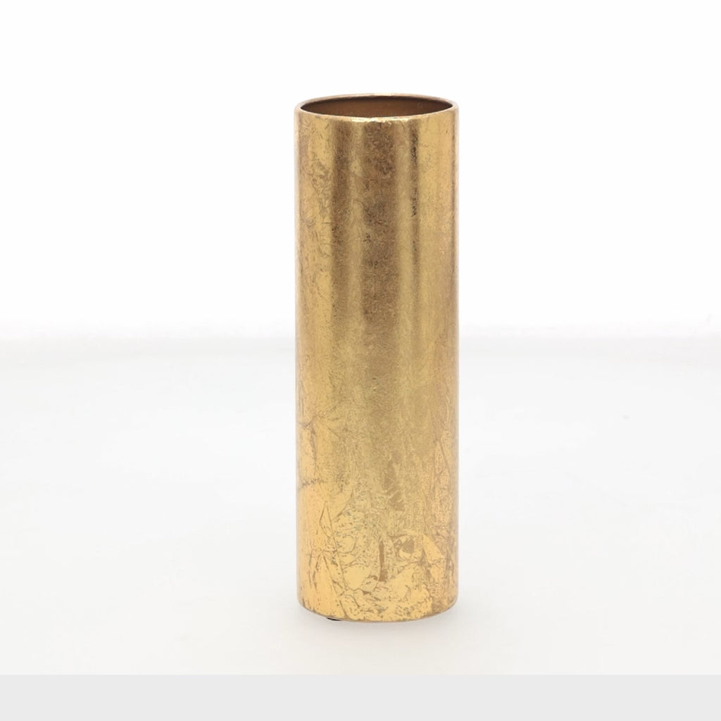 O formato cilíndrico confere uma estética limpa e versátil, adaptando-se facilmente a diferentes estilos de decoração, desde ambientes mais clássicos até os mais contemporâneos. Sua estrutura robusta garante durabilidade, enquanto o acabamento dourado torna-se o centro das atenções em mesas, aparadores ou prateleiras.