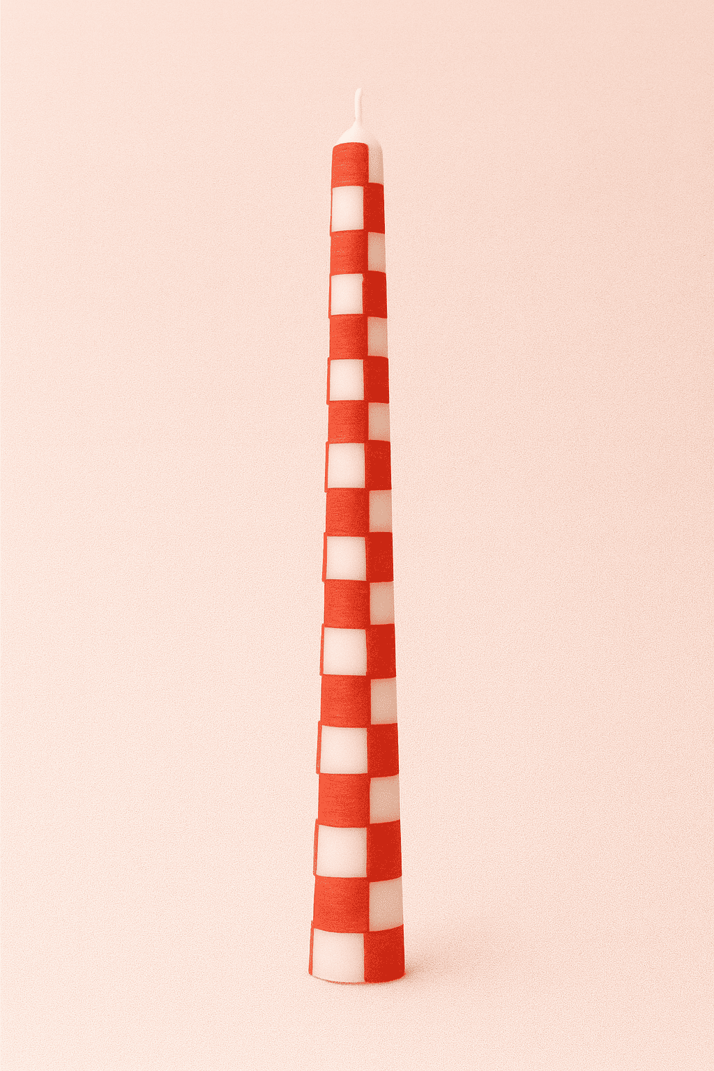 A Vela Cônica Xadrez Vermelha - 26cm é o toque de cor ideal para quem busca uma decoração moderna e vibrante. Seu padrão xadrez em vermelho e branco cria um visual marcante e cheio de personalidade, perfeito para trazer energia e estilo à mesa ou a qualquer ambiente.